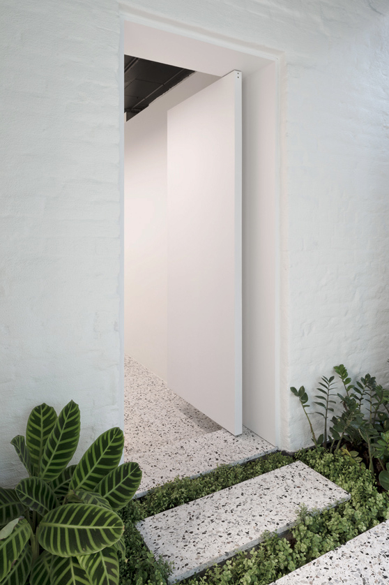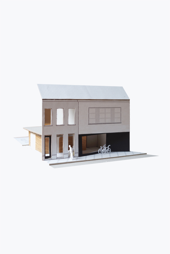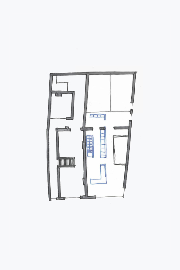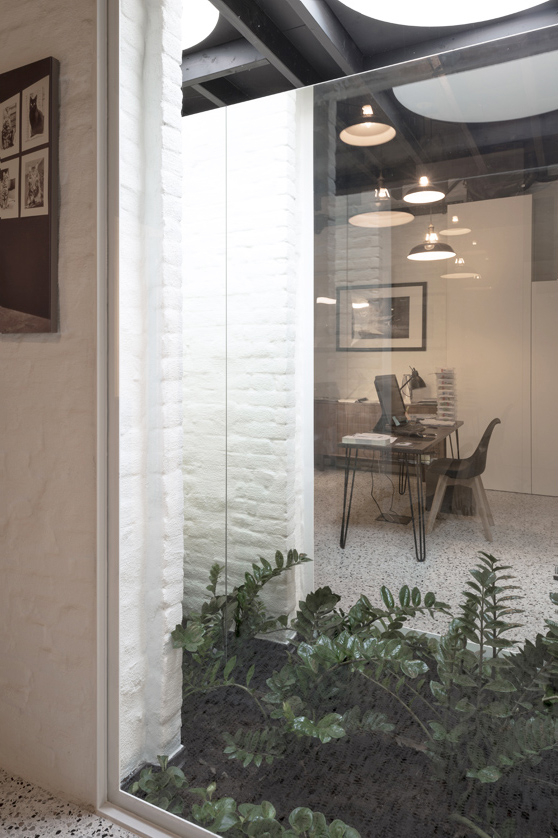 De logische relatie tussen beide panden werd gevonden door op twee ‘vrije plaatsen’ de gemene muur te doorbreken. Een centraal meubel – deels bestaand, deels nieuw – vormt het basisconcept en creëert eenheid en organisatie.