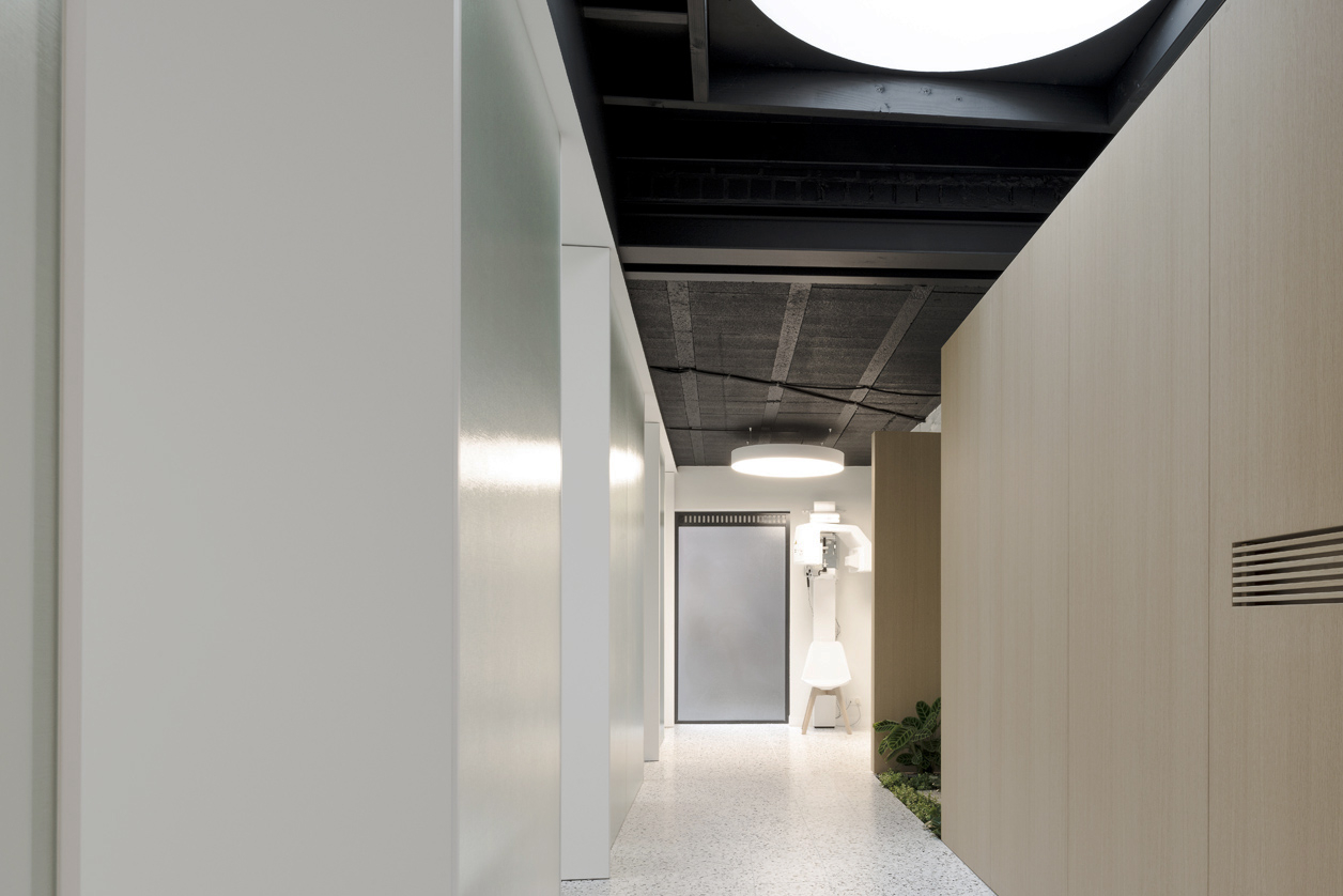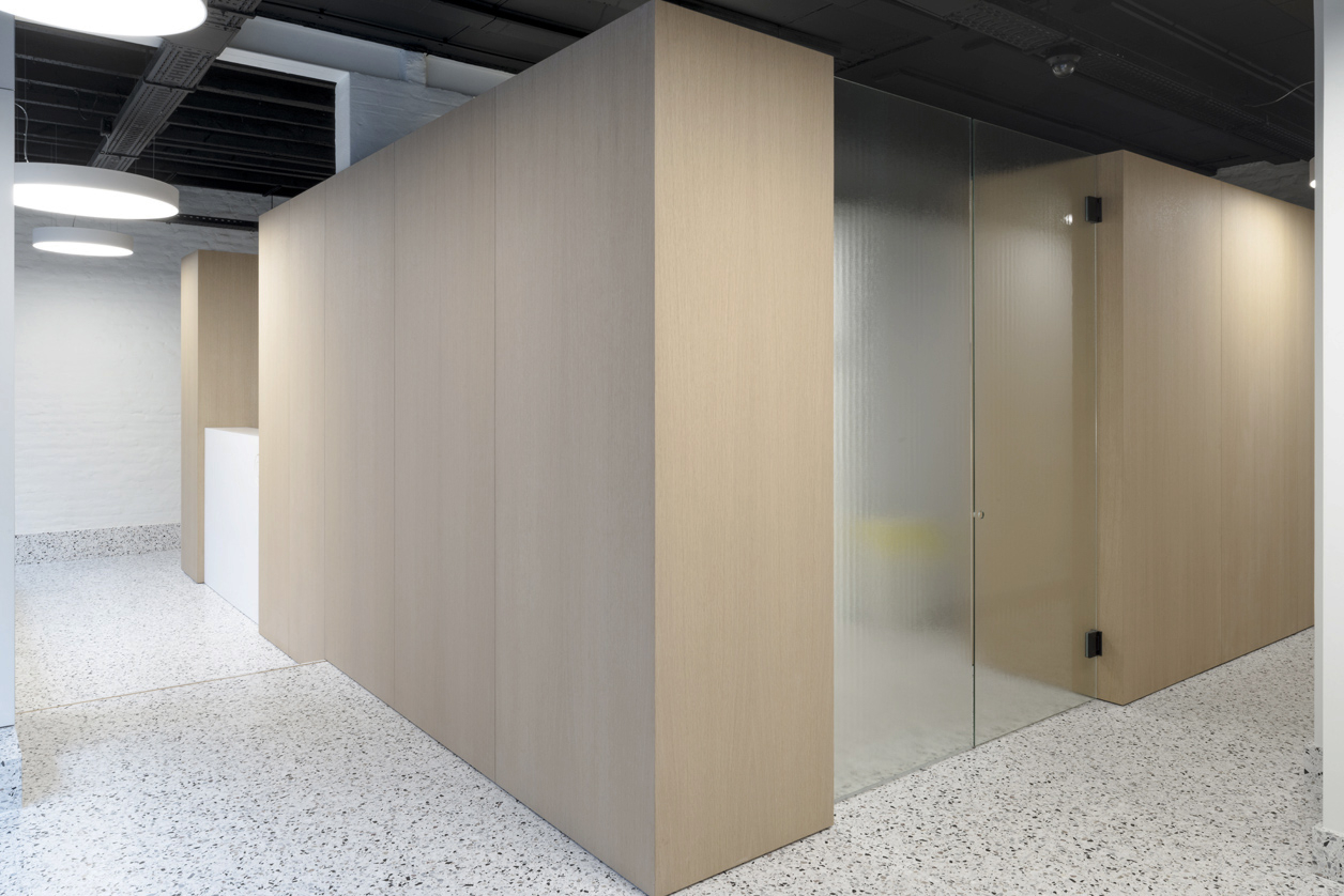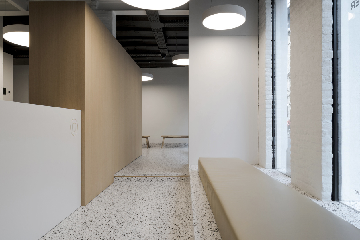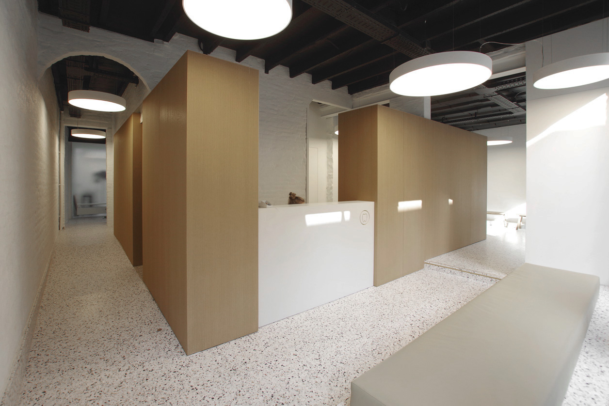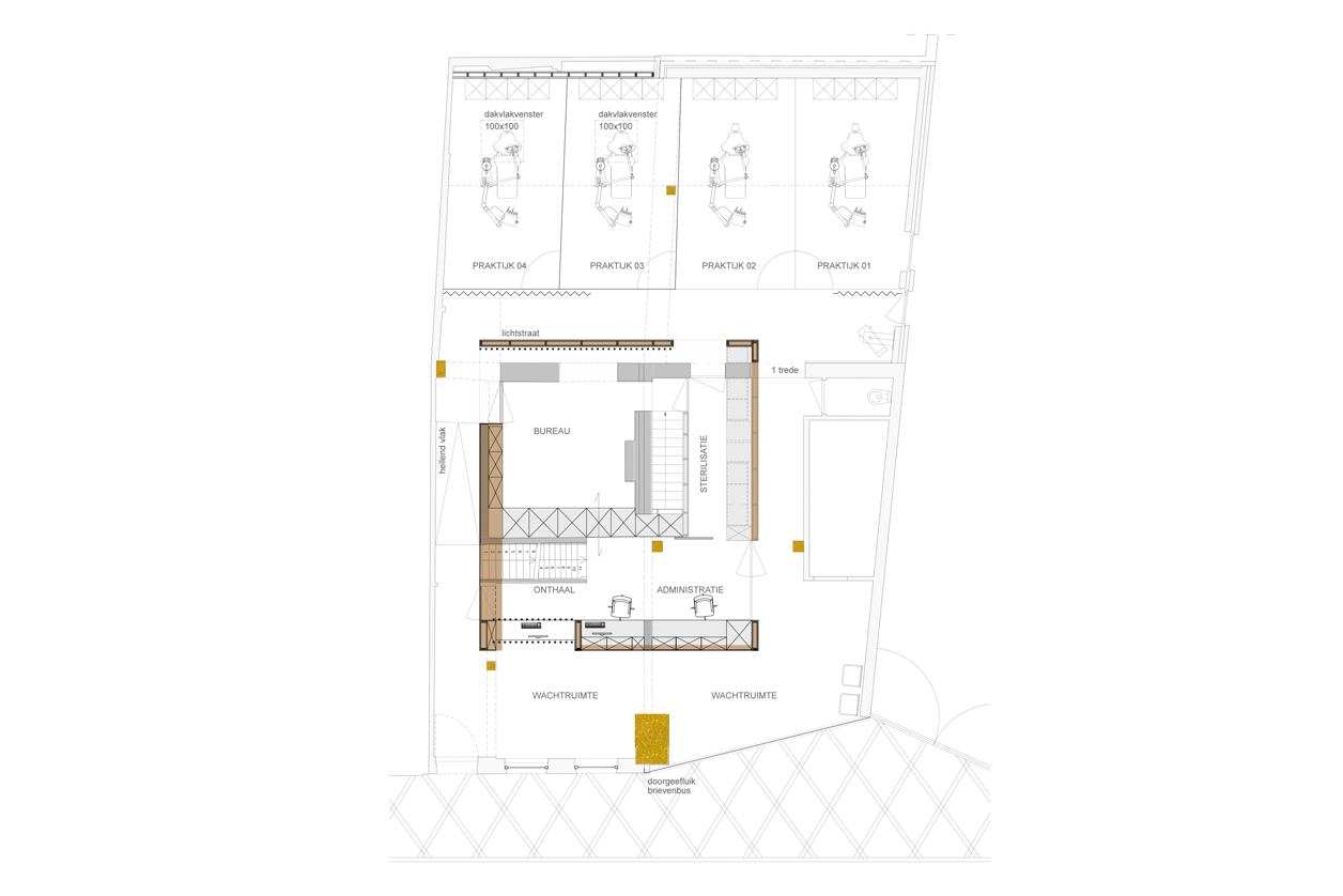De patiënt circuleert rondom deze centrale box die alle backoffice-functies verbergt. Een lichte, onderhoudsvriendelijke tegelvloer werkt als drager voor het scherp afgelijnde meubel in warm eiken fineer. Dit in contrast met het zwart geschilderde, bruut gelaten plafond en de wit gekaleide, ruwe baksteen van de bestaande muren.