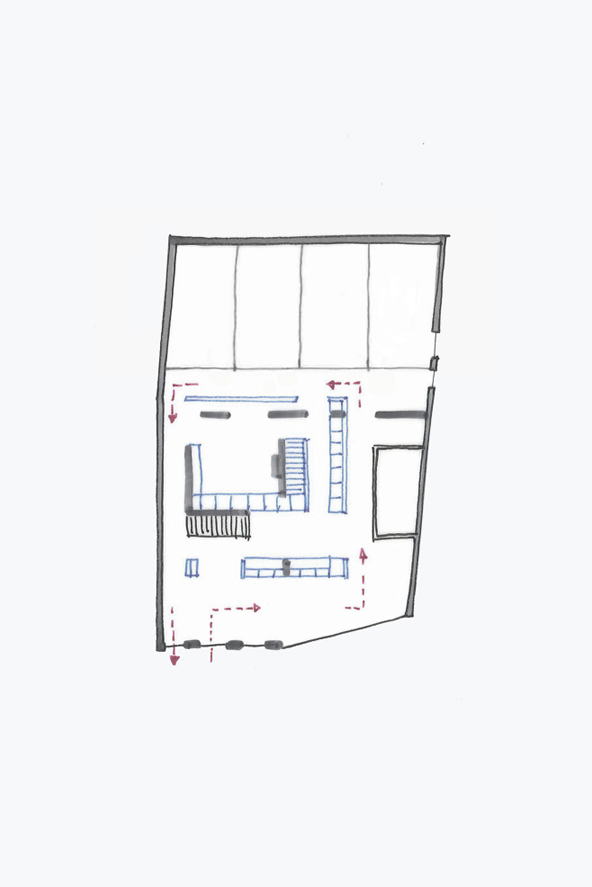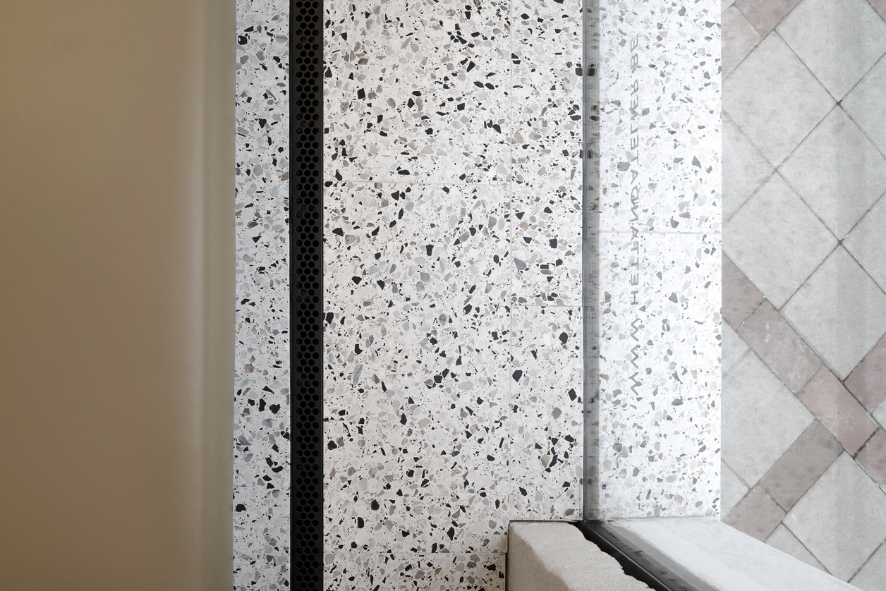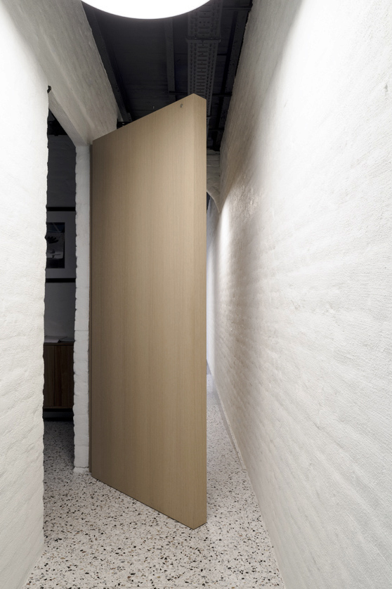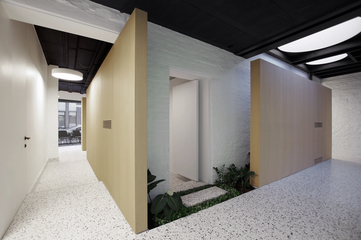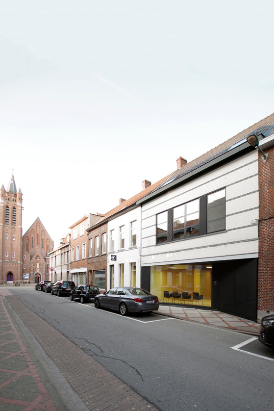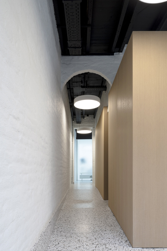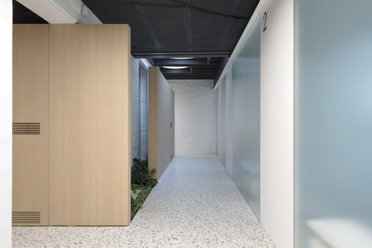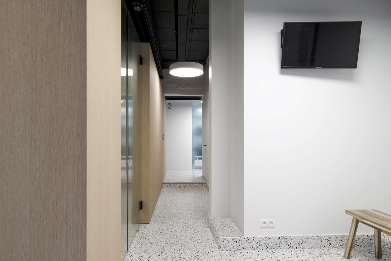 De patiënt circuleert rondom deze centrale box die alle backoffice-functies verbergt. Een lichte, onderhoudsvriendelijke tegelvloer werkt als drager voor het scherp afgelijnde meubel in warm eiken fineer. Dit in contrast met het zwart geschilderde, bruut gelaten plafond en de wit gekaleide, ruwe baksteen van de bestaande muren.