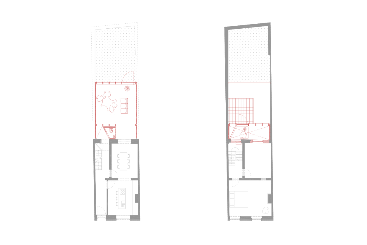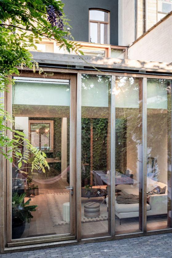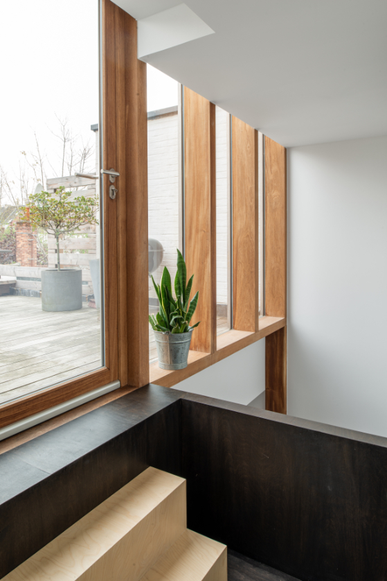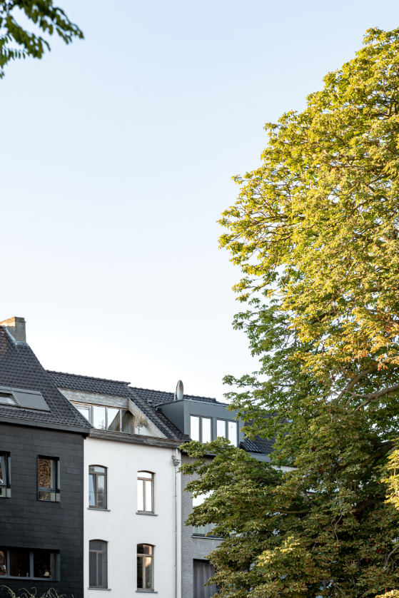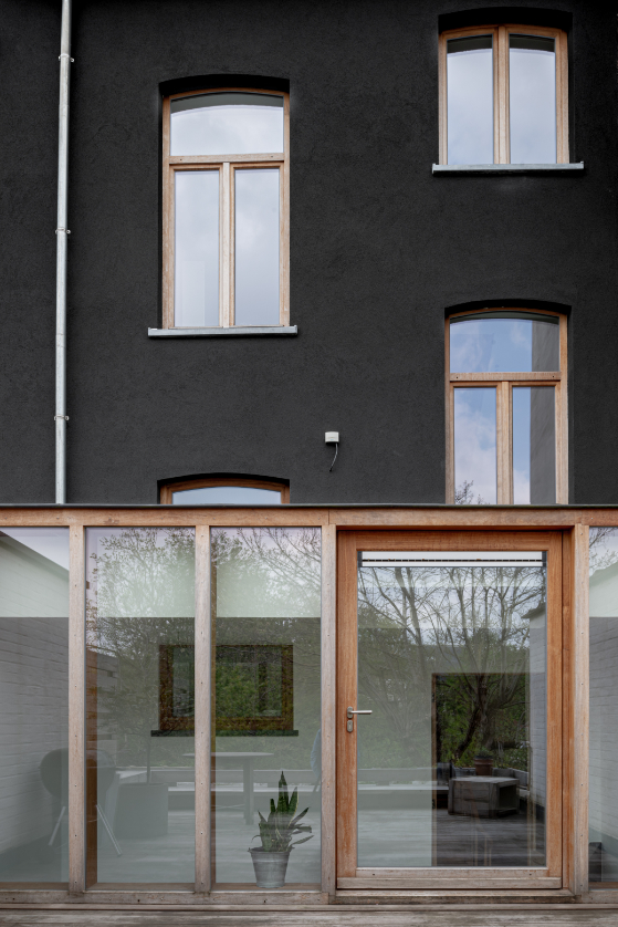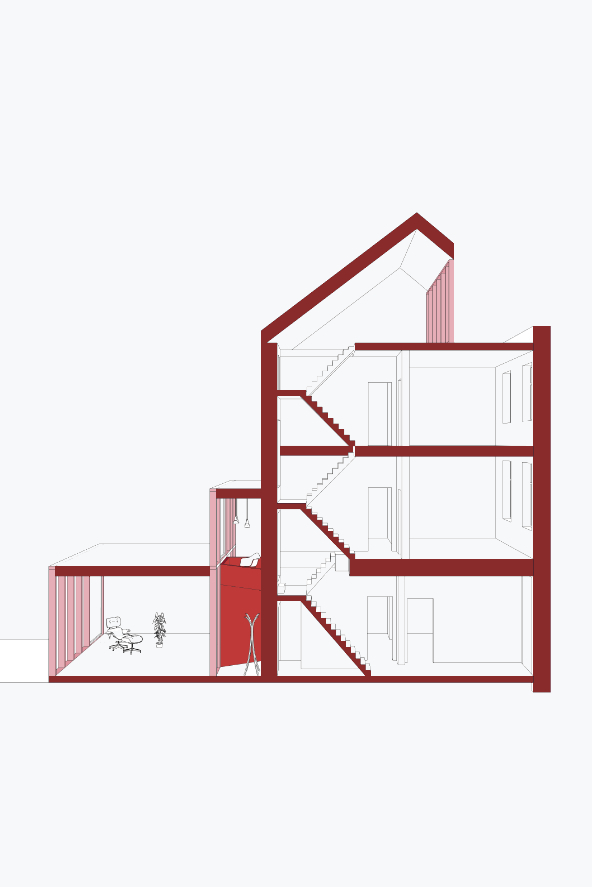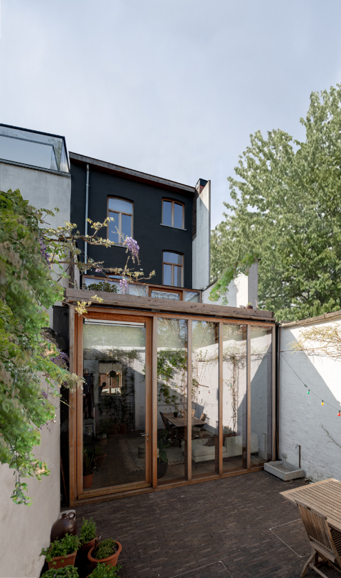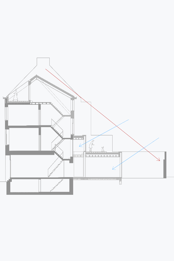 Onze strategie: we breken bestaande achterbouwen af en creëren een nieuwe achterbouw als leefruimte. Het werd een ontwerpen in snede met een trapvorm als uitkomst om zoveel mogelijk licht binnen te trekken. Zo kan het noorderlicht op twee verdiepen doordringen in het huis. Zo kan de zuidzon de kleine stadstuin maximaal oplichten als gezellige ommuurde koer.