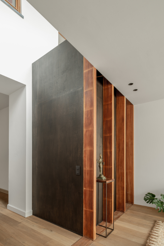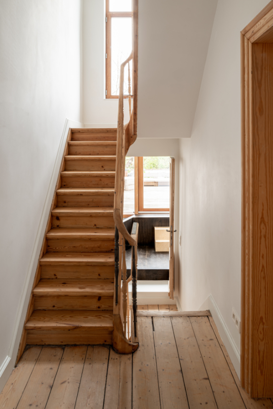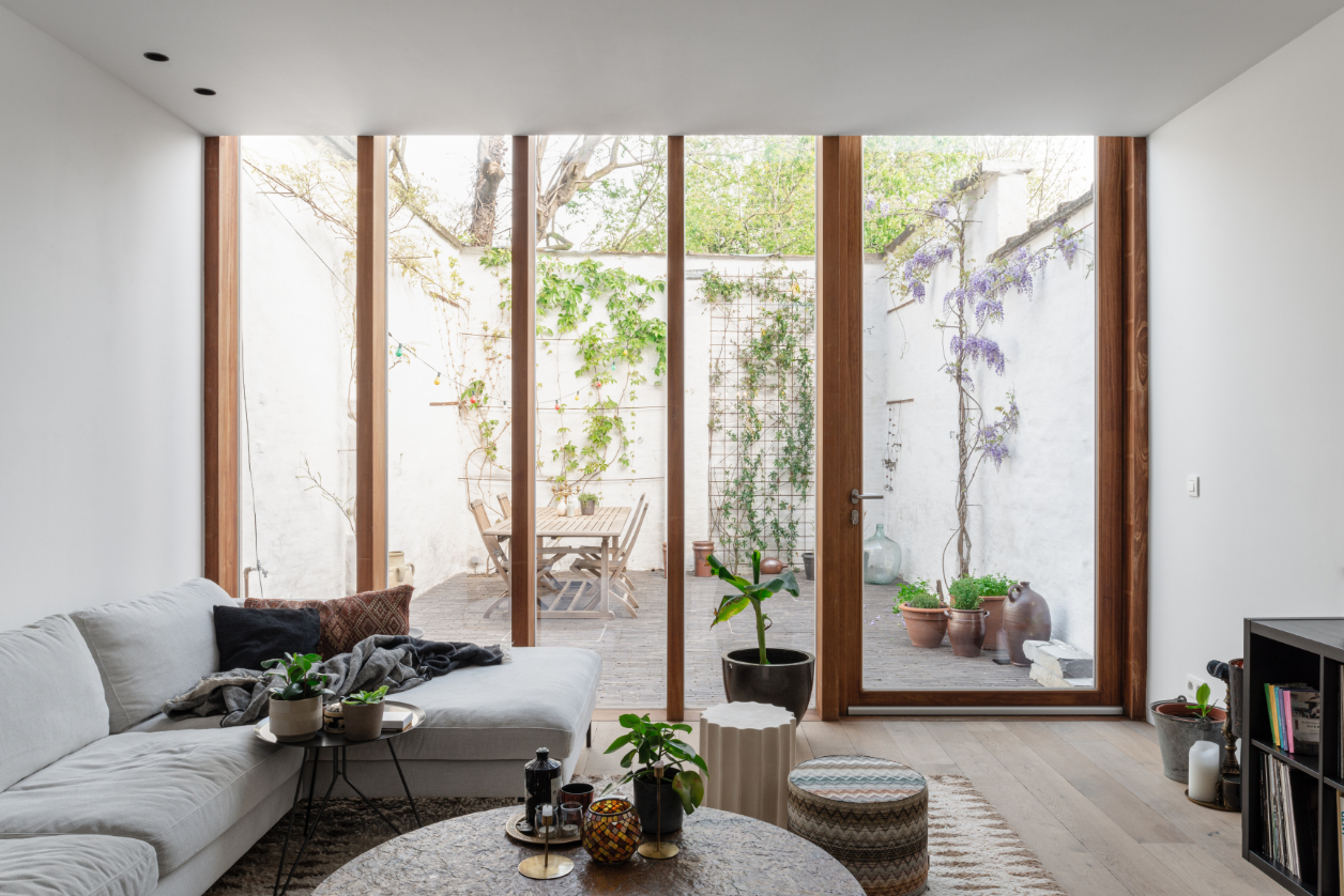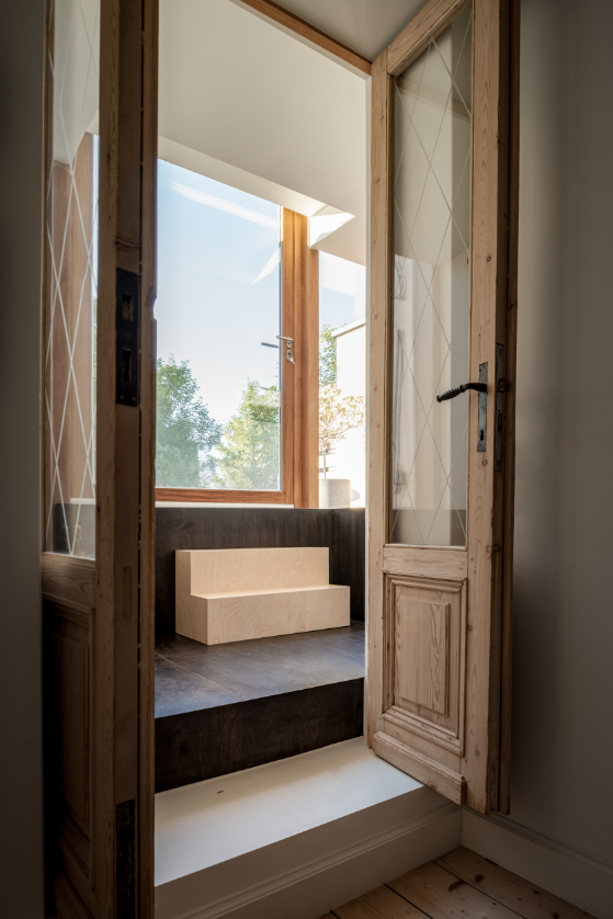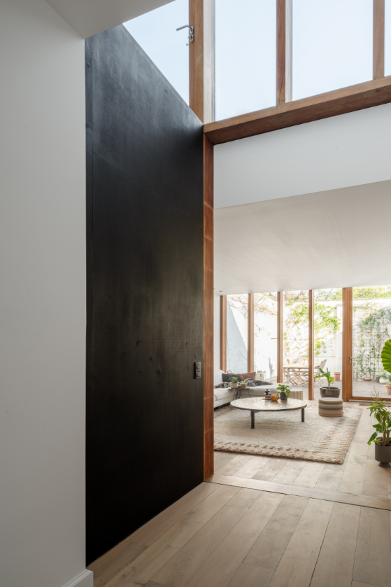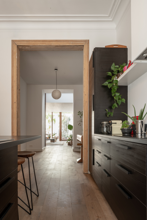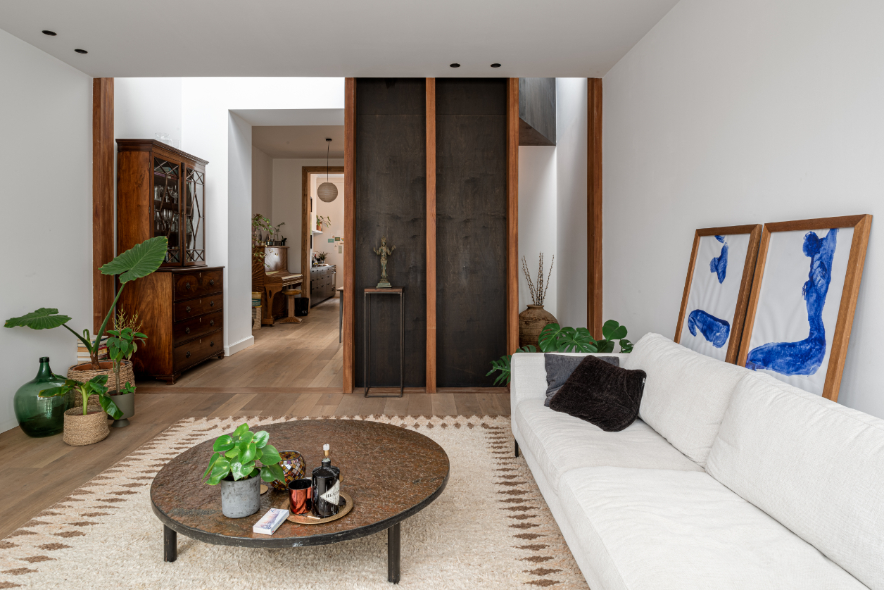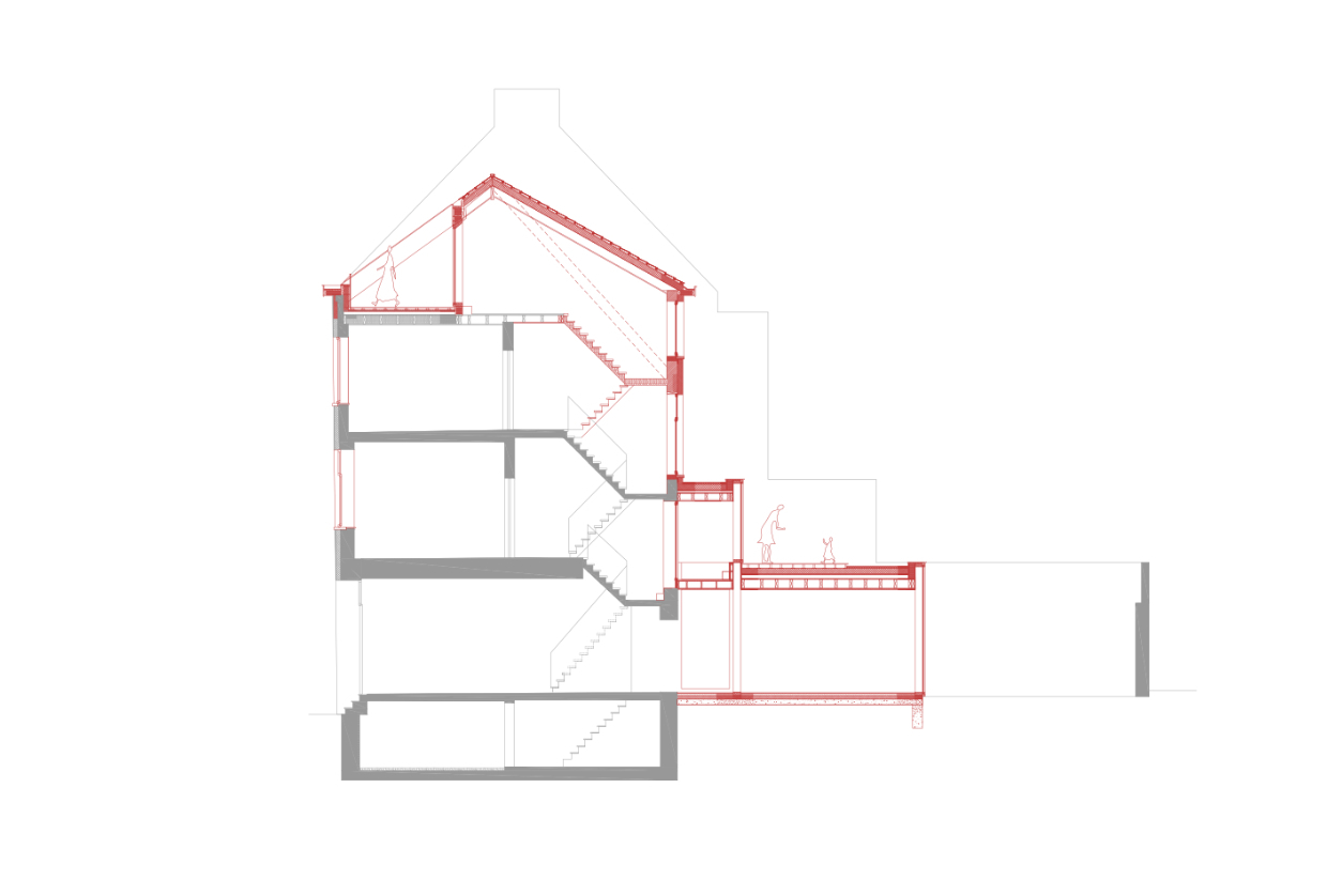 Onze strategie: we breken bestaande achterbouwen af en creëren een nieuwe achterbouw als leefruimte. Het werd een ontwerpen in snede met een trapvorm als uitkomst om zoveel mogelijk licht binnen te trekken. Zo kan het noorderlicht op twee verdiepen doordringen in het huis. Zo kan de zuidzon de kleine stadstuin maximaal oplichten als gezellige ommuurde koer.
