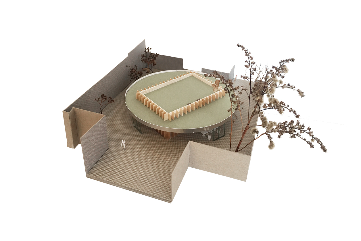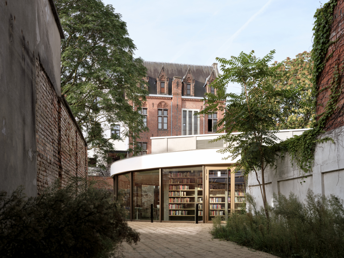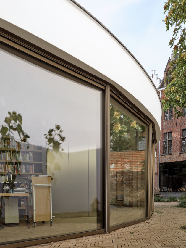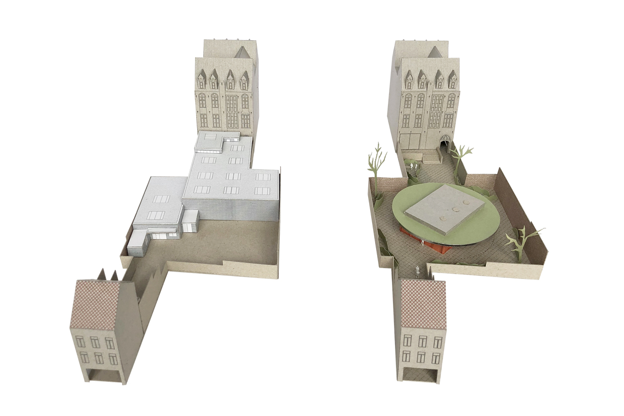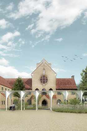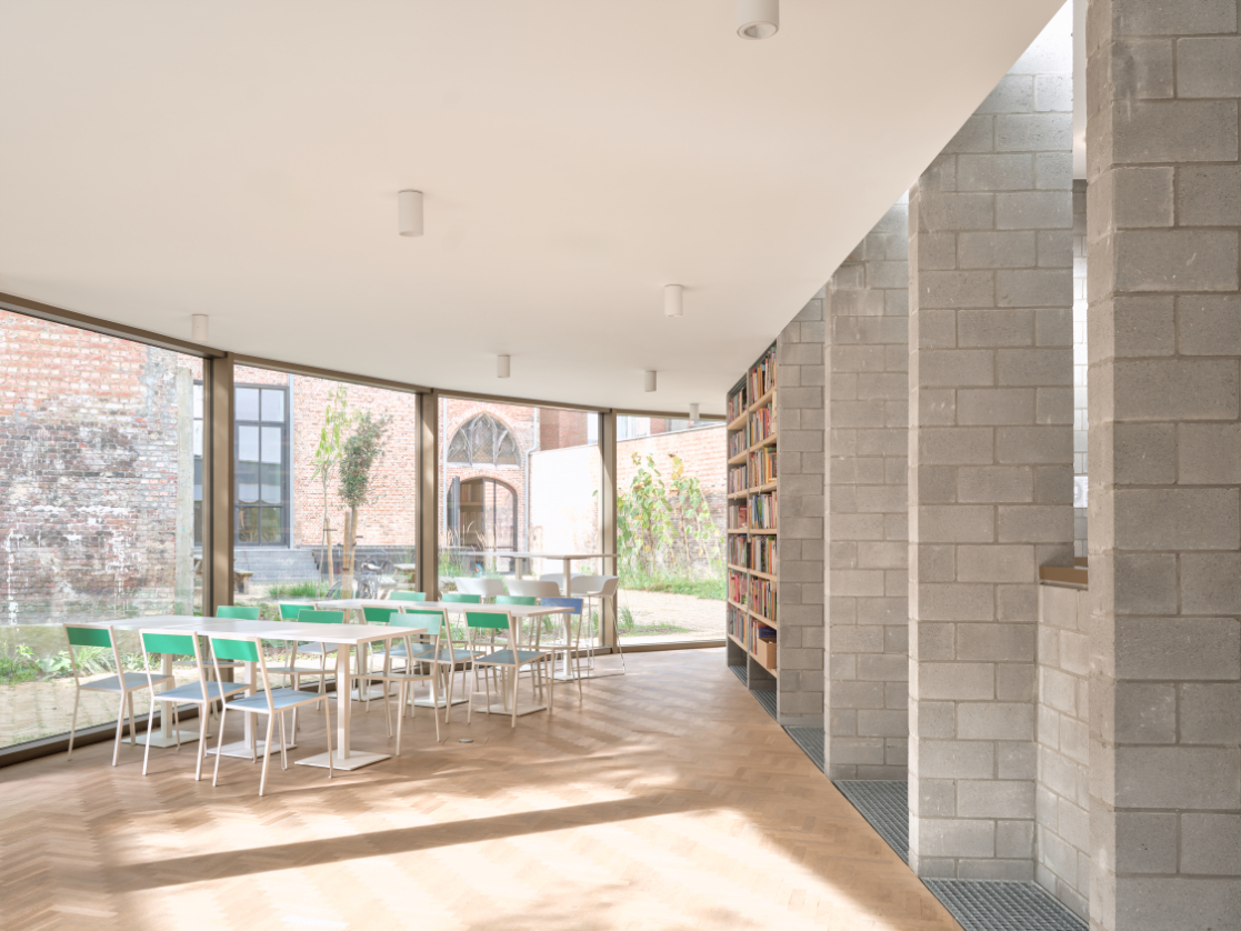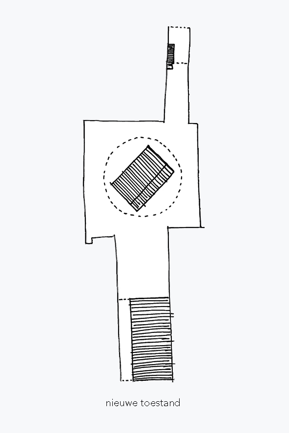 Een nieuwe toevoeging op maat van de specifieke vraag en het programma. Een centraal gelegen ontmoetingspaviljoen omringd met zo veel mogelijk buitenruimte. Het gelijkvloers van de site als semi-publiek gebied. Openheid en doorwaadbaarheid van het binnengebied blijft hierbij behouden en wordt versterkt.