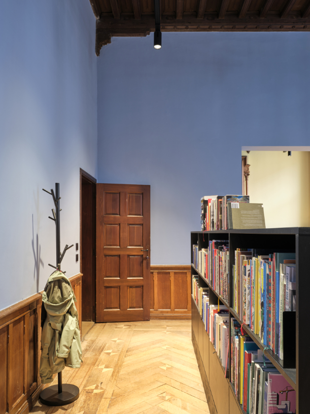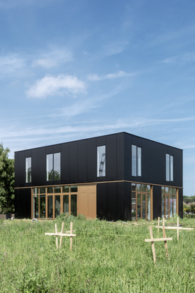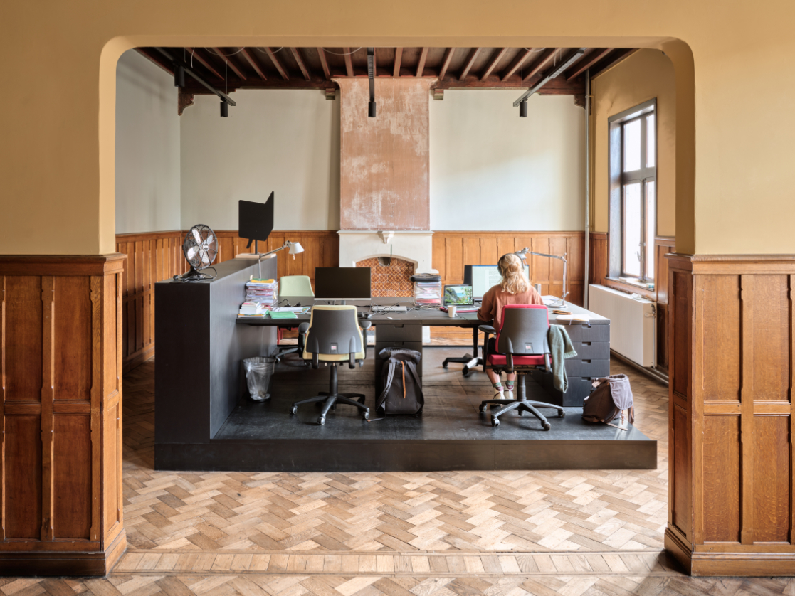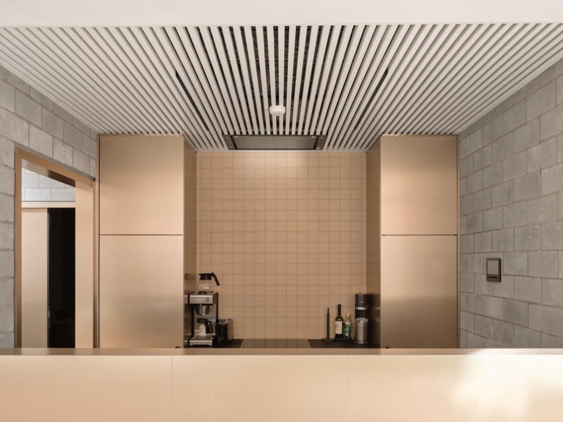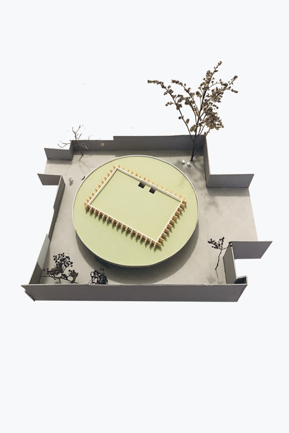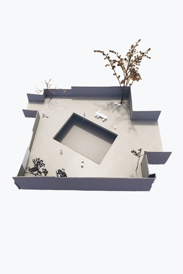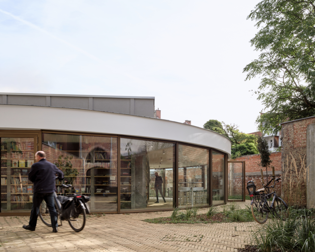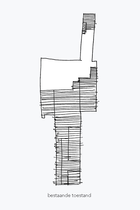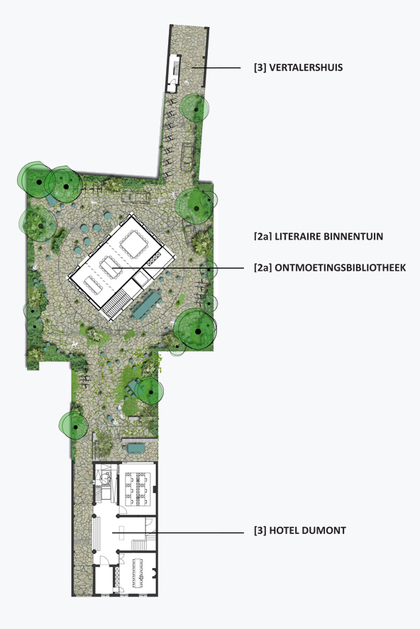 Een nieuwe toevoeging op maat van de specifieke vraag en het programma. Een centraal gelegen ontmoetingspaviljoen omringd met zo veel mogelijk buitenruimte. Het gelijkvloers van de site als semi-publiek gebied. Openheid en doorwaadbaarheid van het binnengebied blijft hierbij behouden en wordt versterkt.