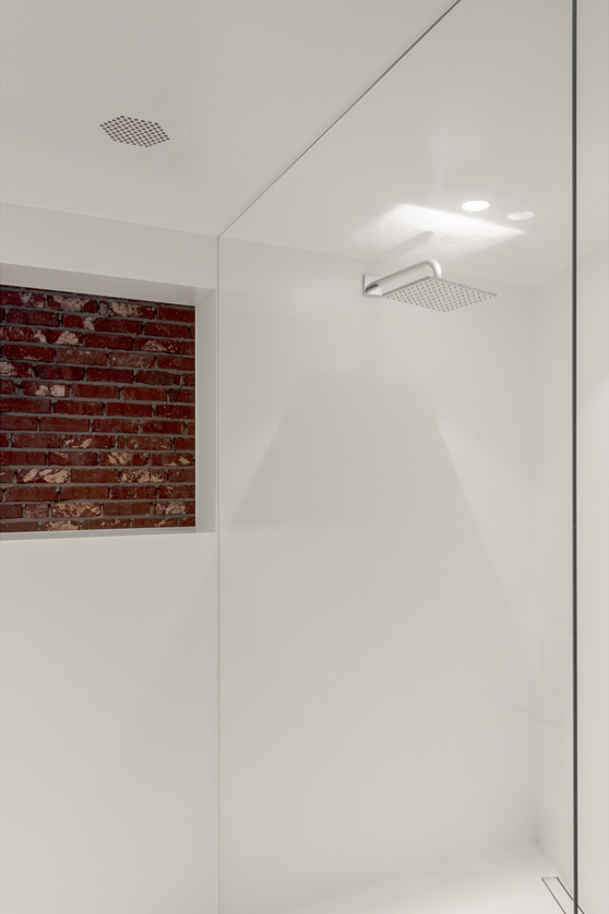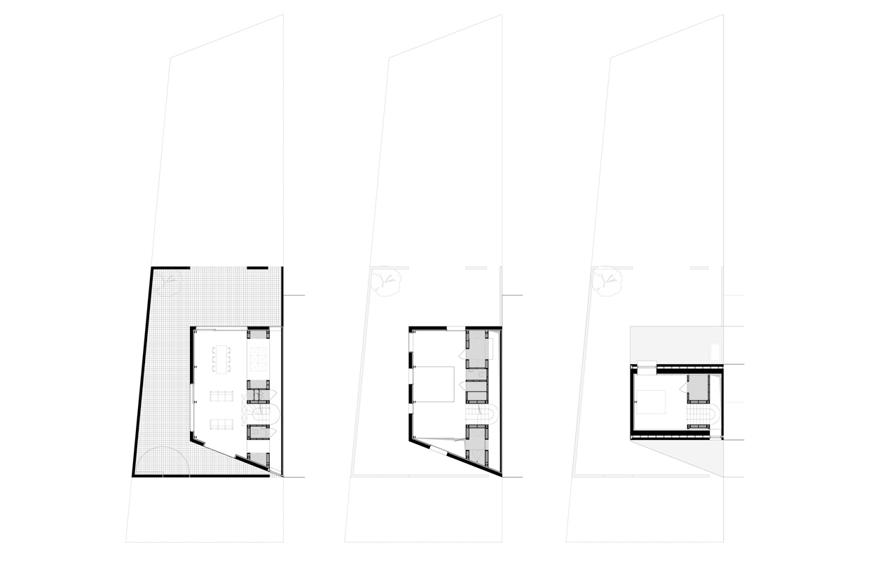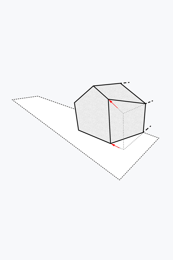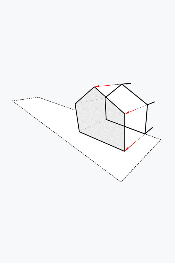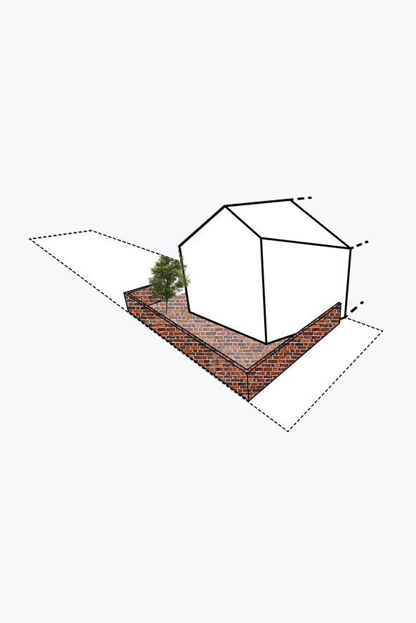 Het nieuwe volume volgt het profiel van de naastliggende buur. Door een hoek van dit volume af te snijden brengen we overal rechtstreeks zonlicht binnen de contouren van de nieuwe tuinmuur. We creëren een private plek in de zon, op elk moment van de dag.