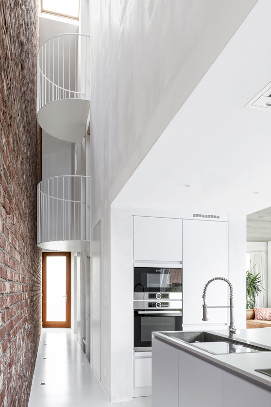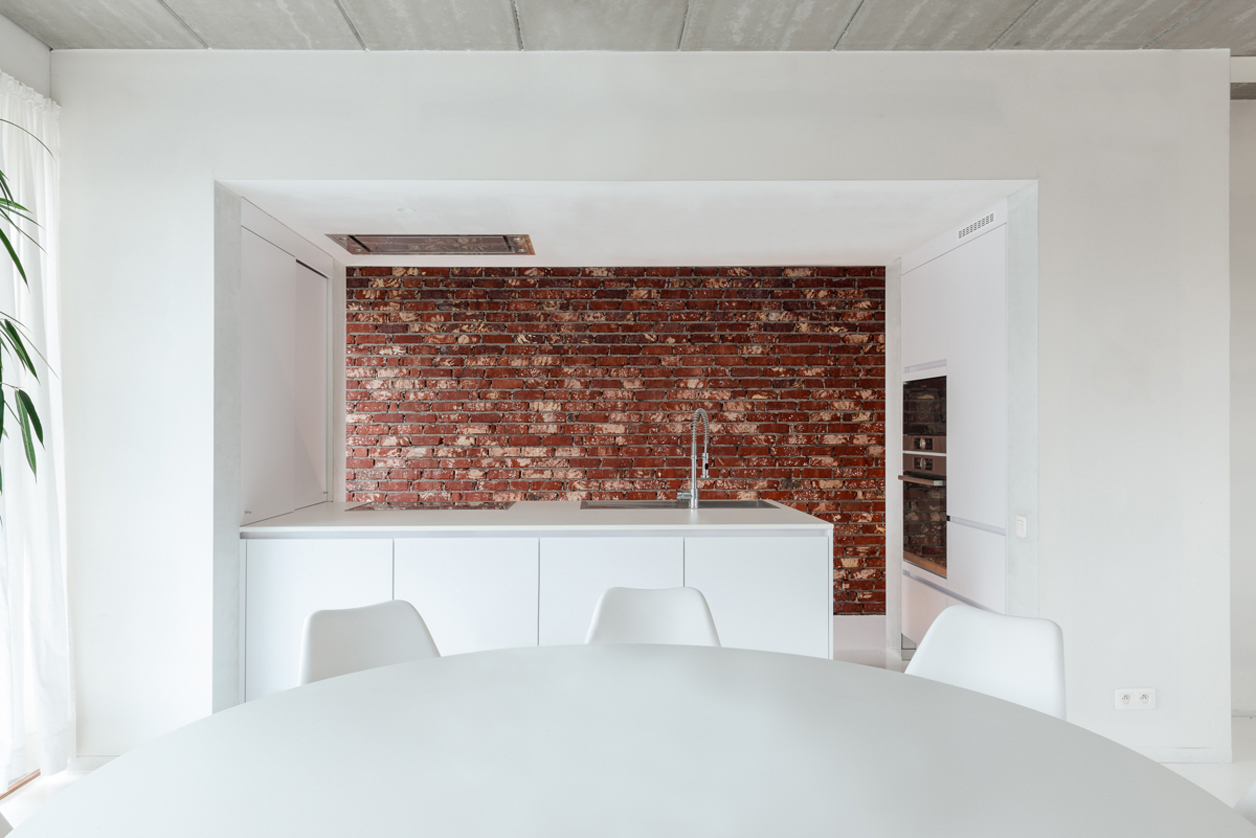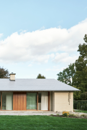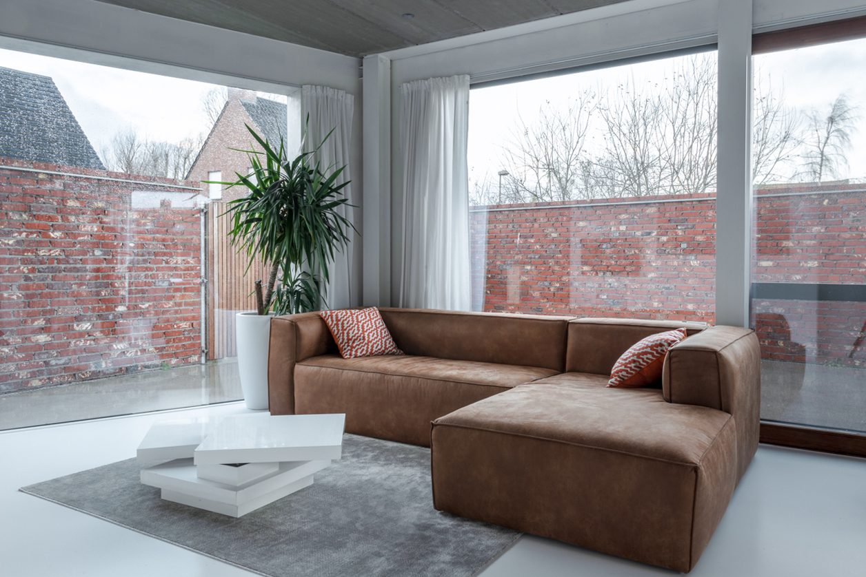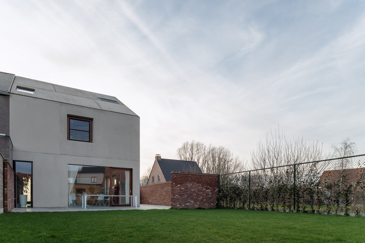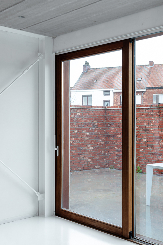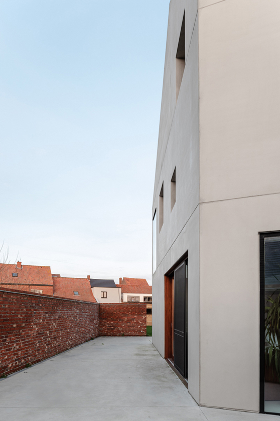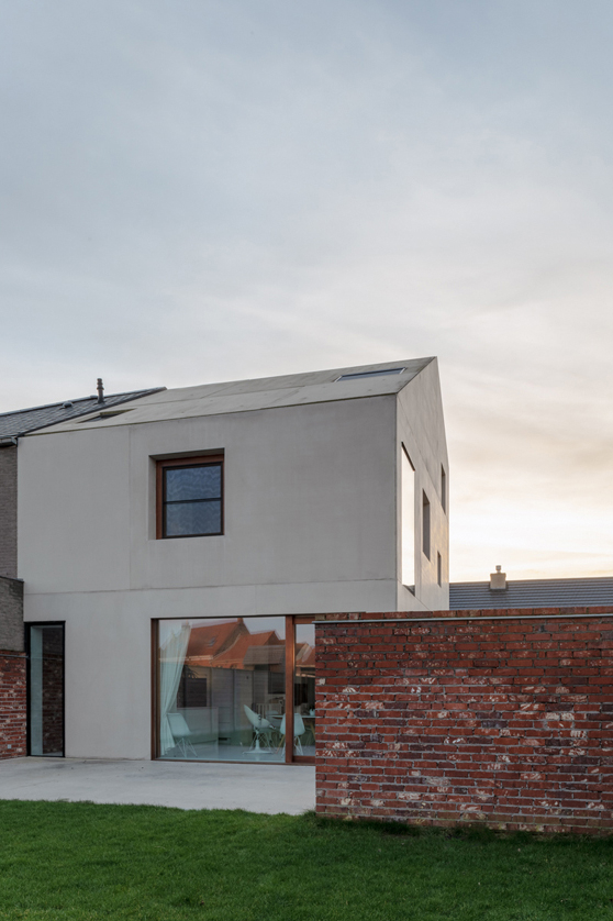 Om de privacy te optimaliseren bouwen we een tuinmuur rond het nieuwe volume. Dit lijnelement bakent een terraszone af voor de woning én vormt een tweede gevel en buitengrens voor de binnenruimtes. Hierdoor vergroot de gelijkvloerse leefruimte visueel sterk, wat een antwoord biedt op het vraagstuk van compact, maar tegelijkertijd wel ruim en groots wonen.
