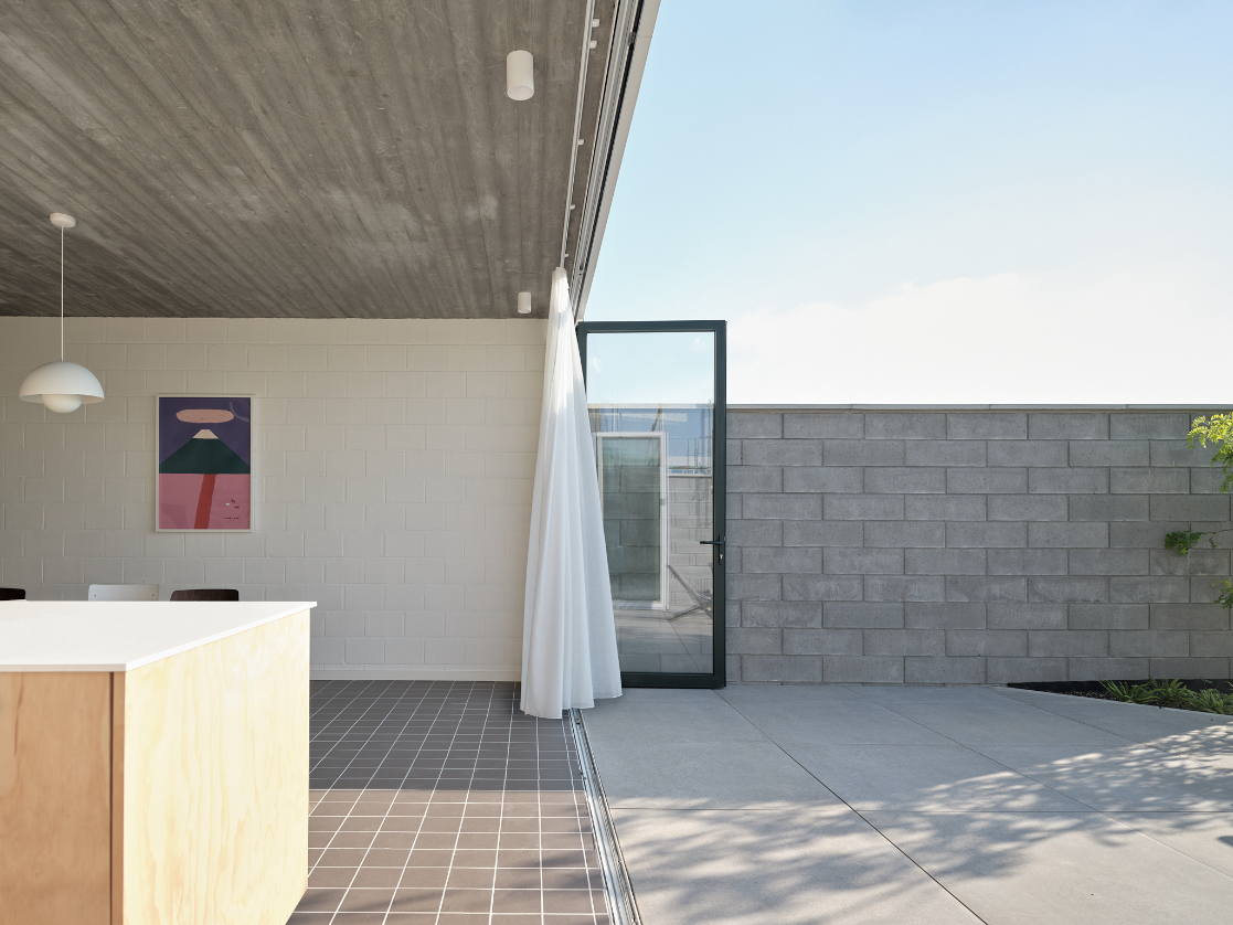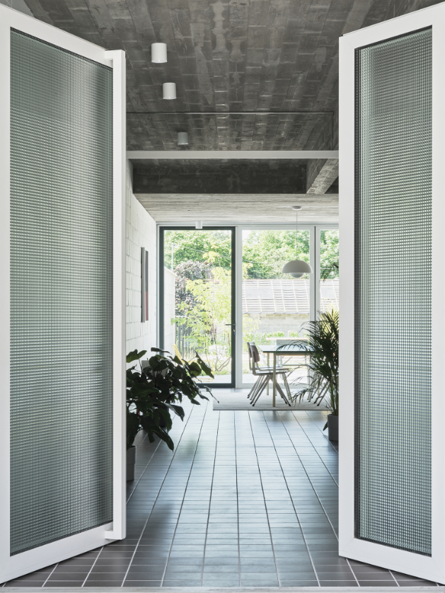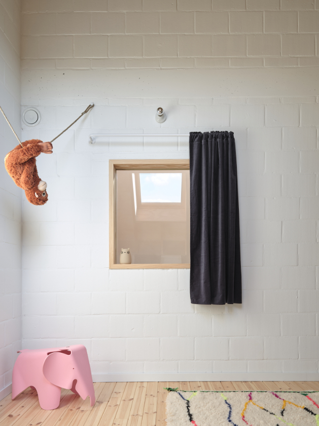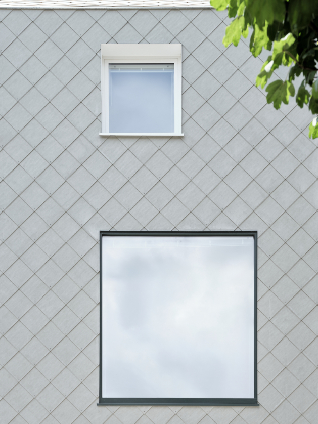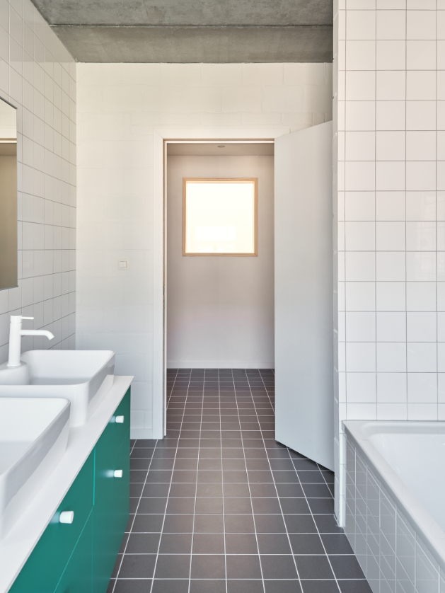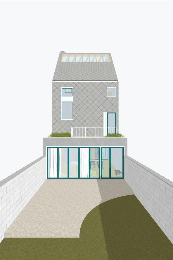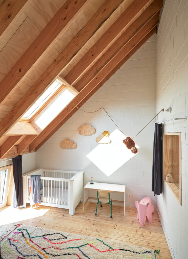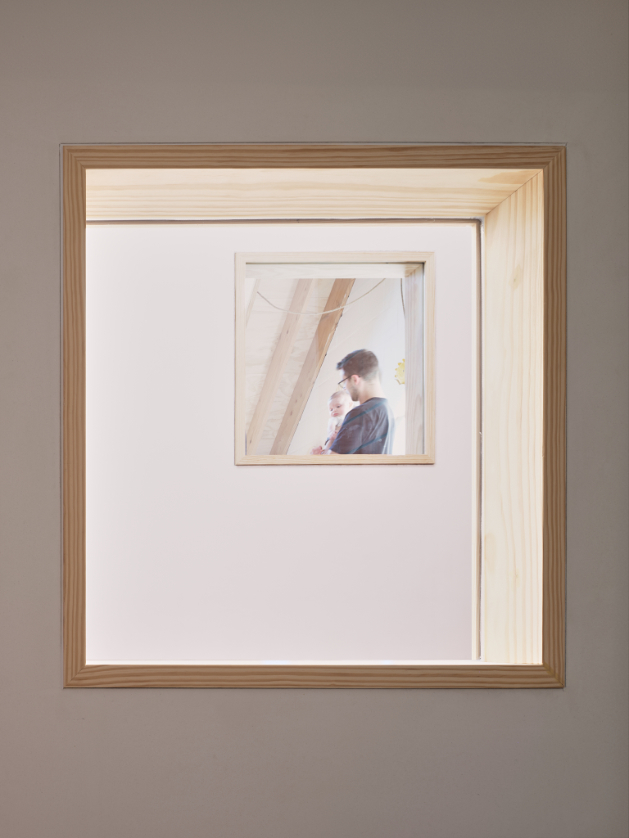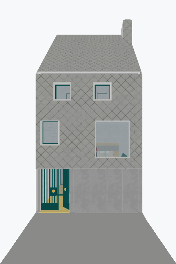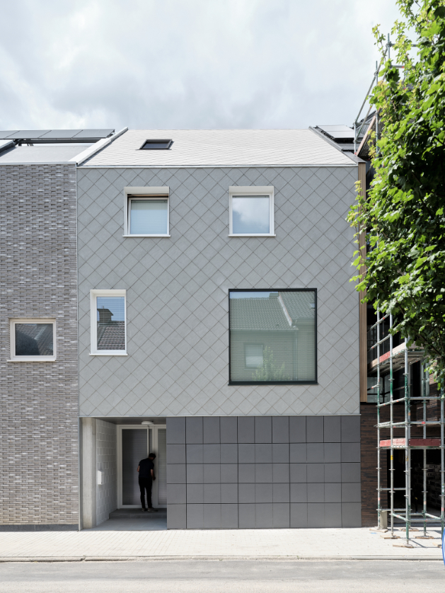 In deze split level woning leven bewoners tussen de drie nieuwe afgesloten volumes. De garage op het gelijkvloers. Een master bedroom en een eerste kinderkamer aan de achtergevel. De badkamer en een tweede kinderkamer aan de voorgevel.