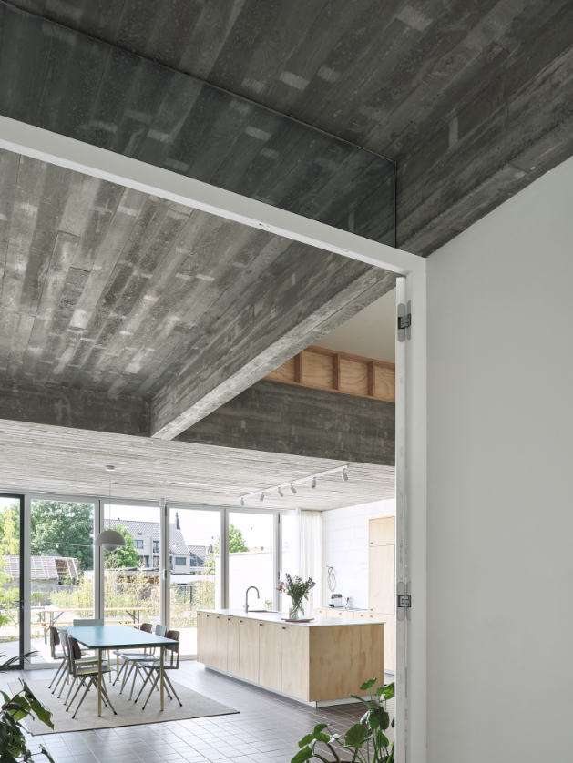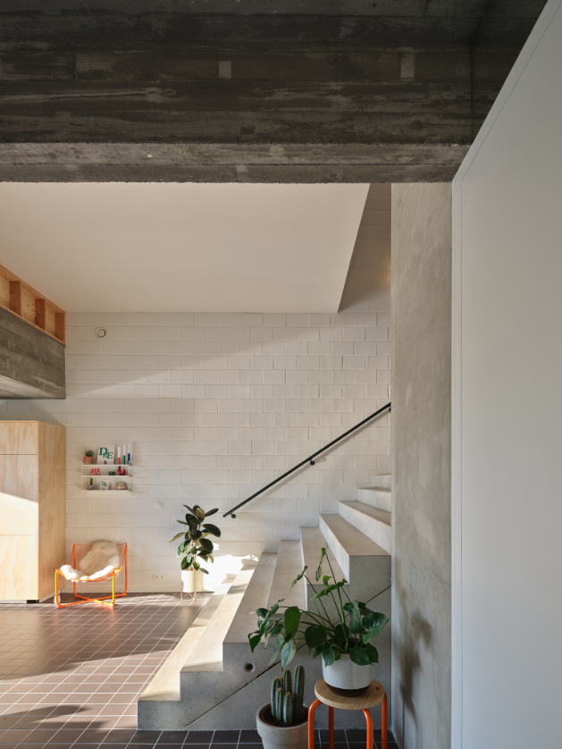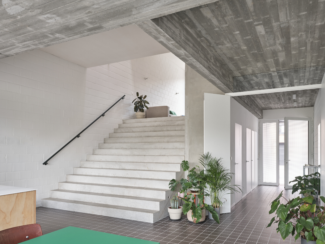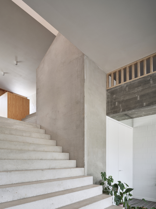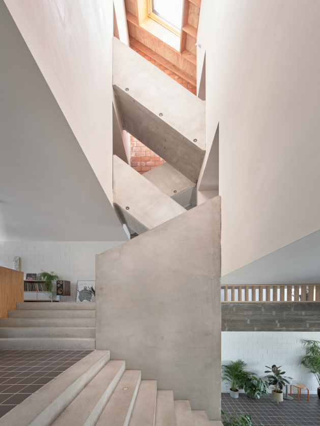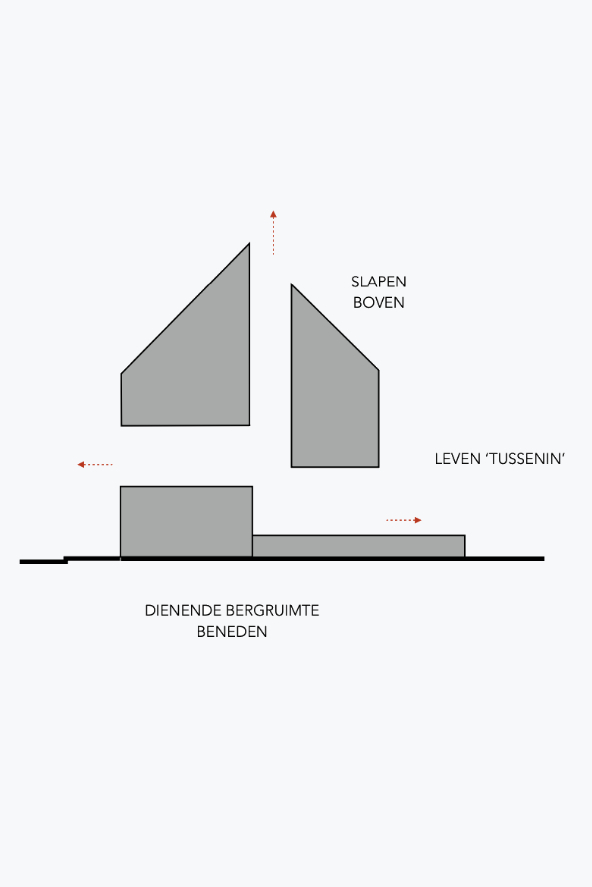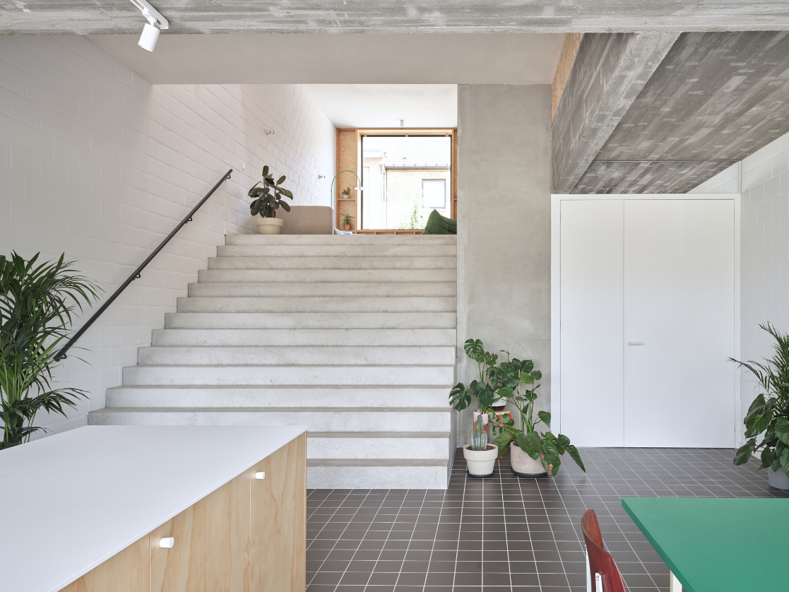 We integreren een betonnen trappenspel in de woning als sculptuur. Een monoliete betontrap als tussenruimte.Split levels verbinden de volumes en positioneren bewoners visueel tegenover elkaar. Een daklicht boven de trap stuwt zenitaal licht doorheen de woning.