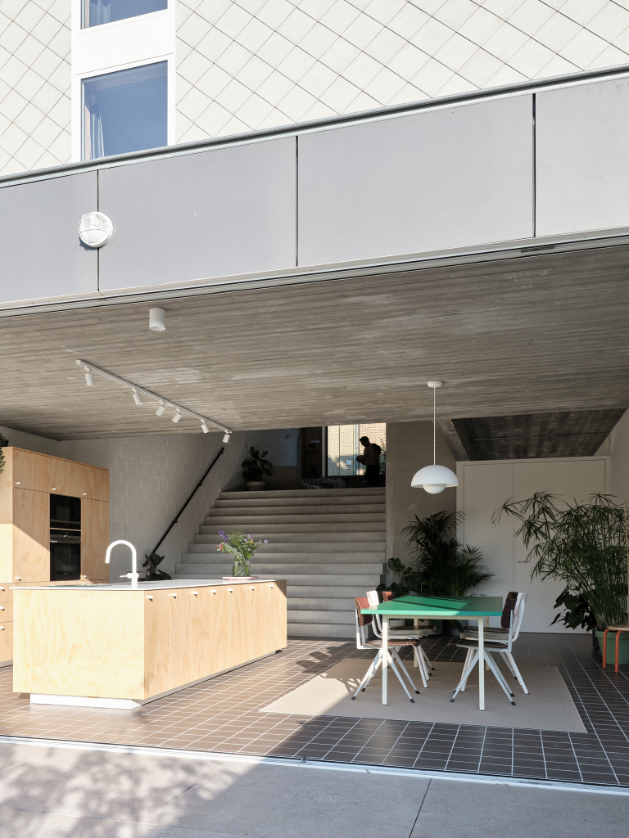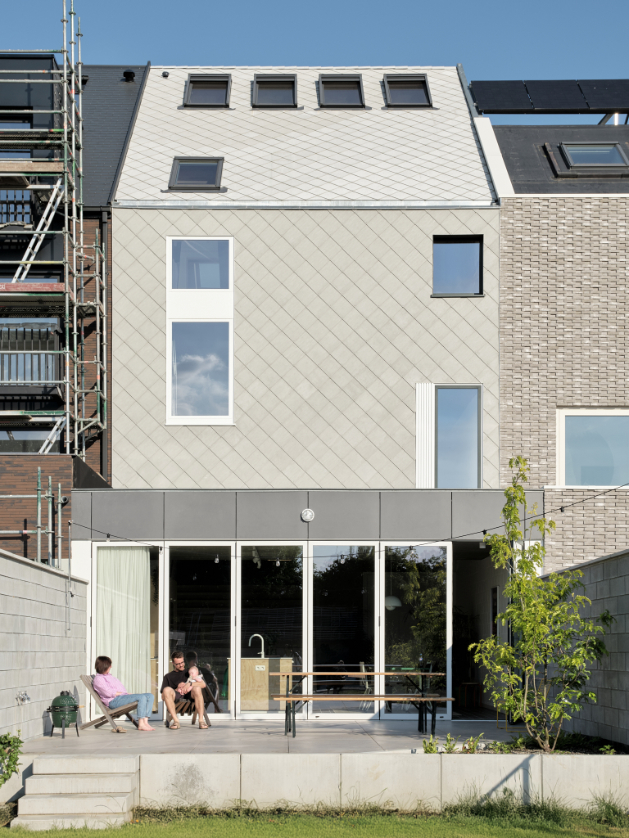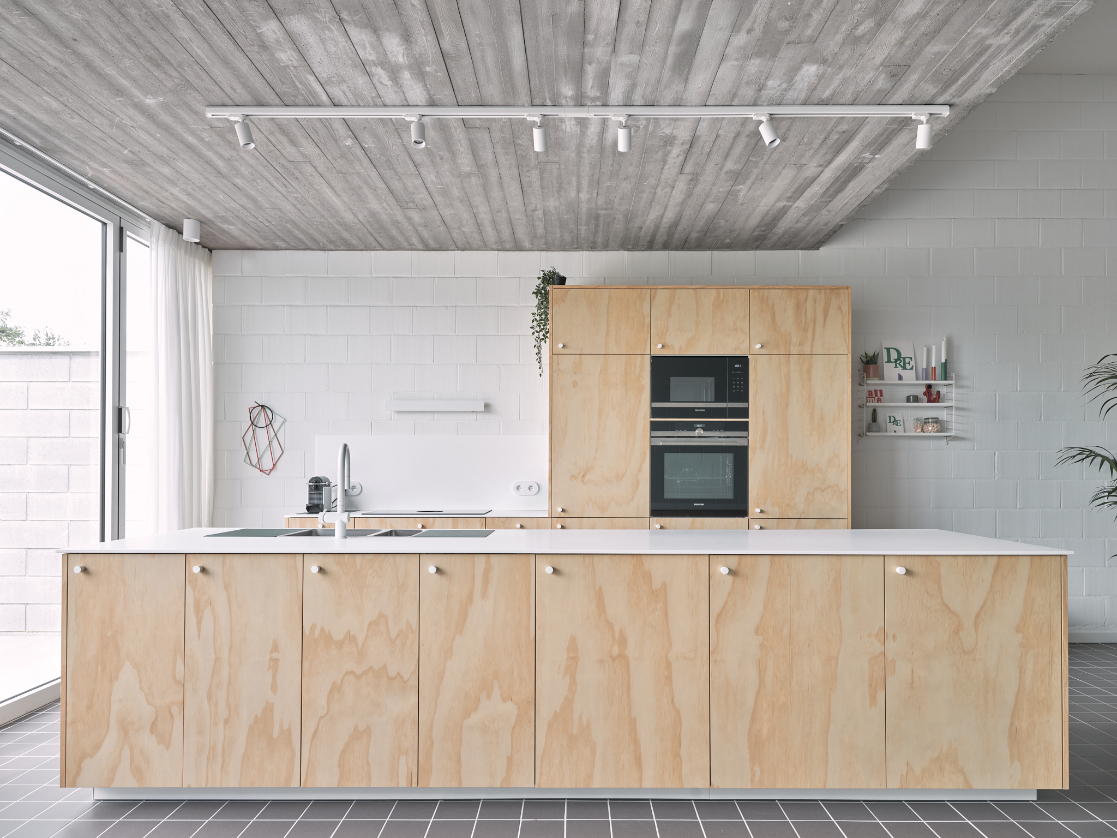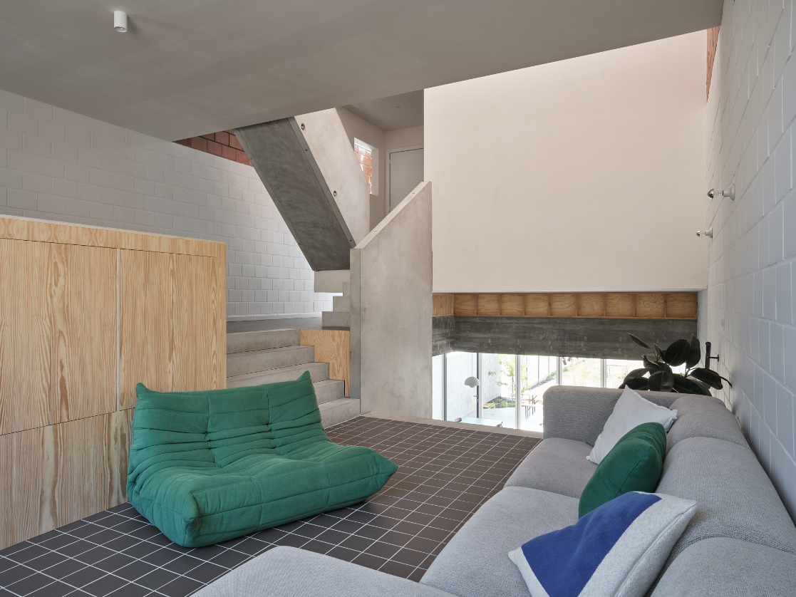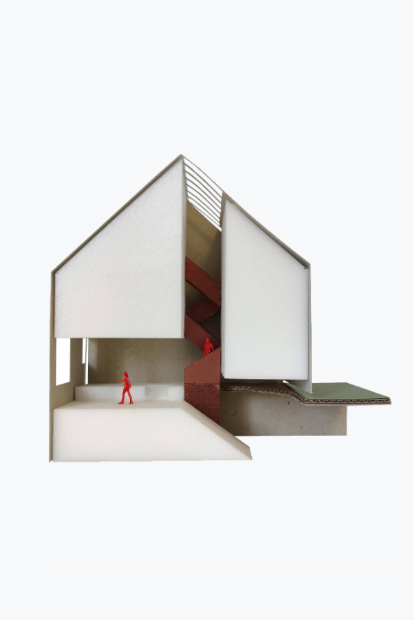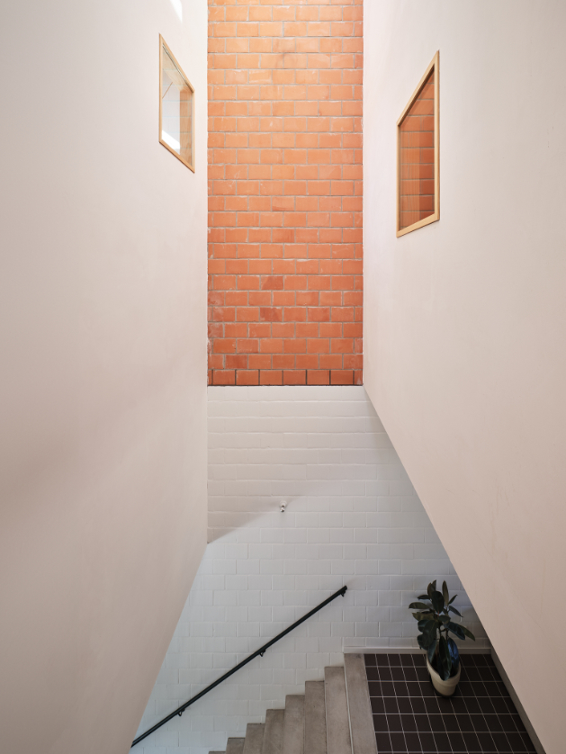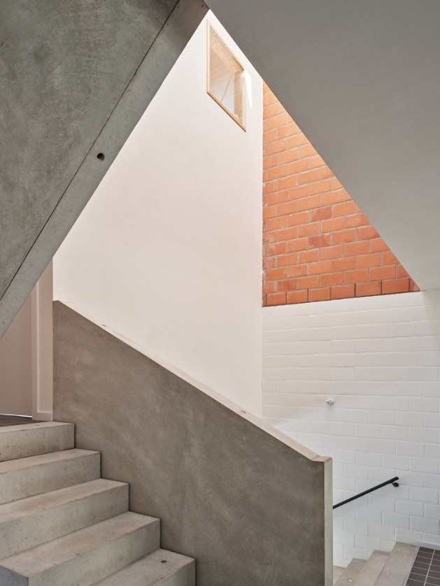 We integreren een betonnen trappenspel in de woning als sculptuur. Een monoliete betontrap als tussenruimte.Split levels verbinden de volumes en positioneren bewoners visueel tegenover elkaar. Een daklicht boven de trap stuwt zenitaal licht doorheen de woning.