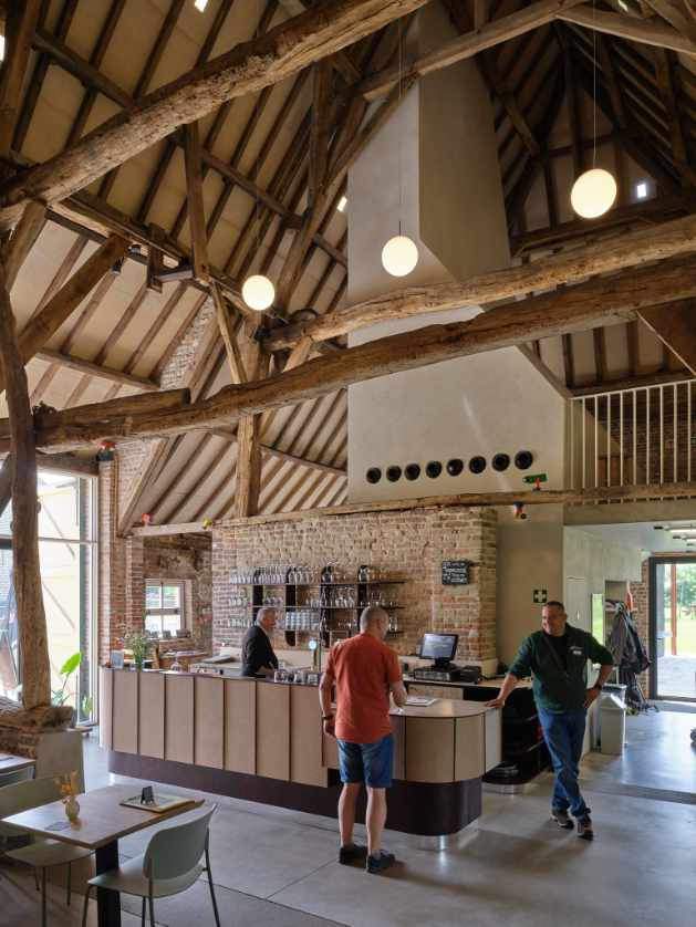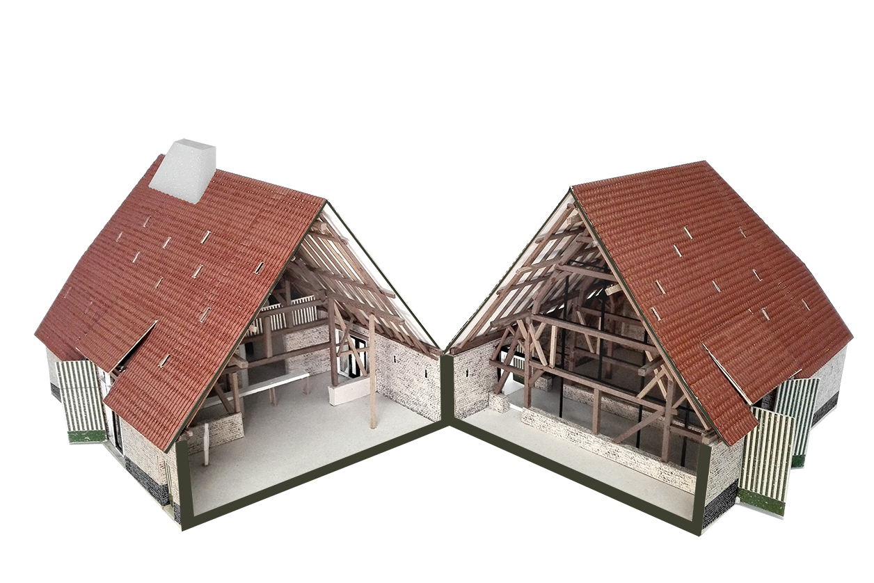 “Hoeven liggen naast elkaar langs straten met een boomgaard tussenin, de akkers liggen erachter in rechthoekige stroken. Grote hofsteden daarentegen liggen afgelegen, afgezonderd van de hoofwegen, te midden van de akkers die tot het hof behoren. Zij zijn slechts bereikbaar langs een landweg of een dreef."