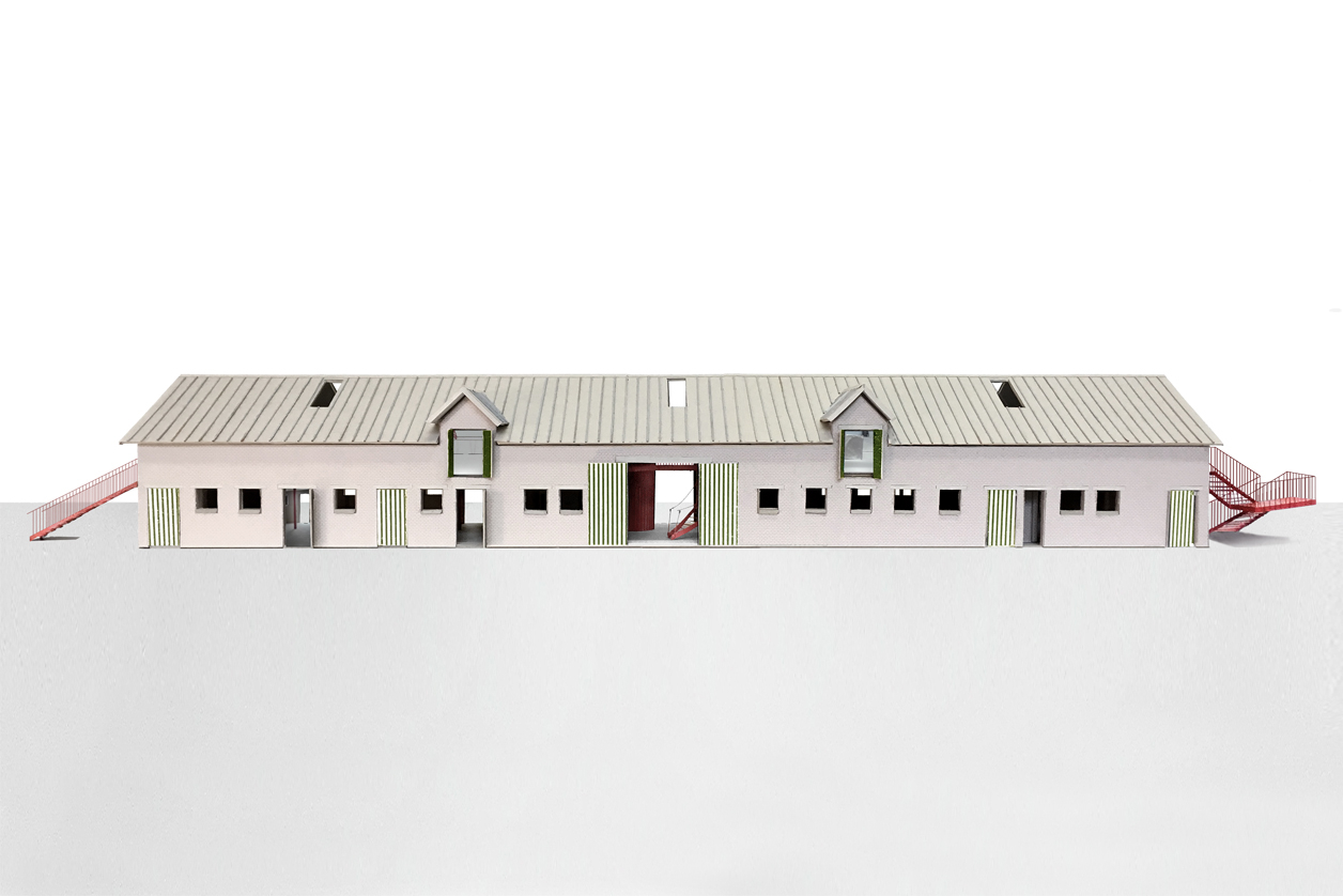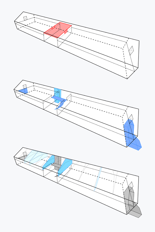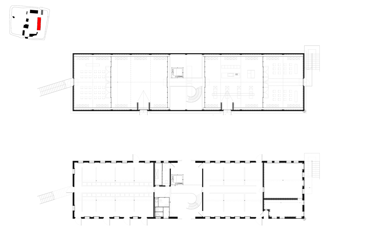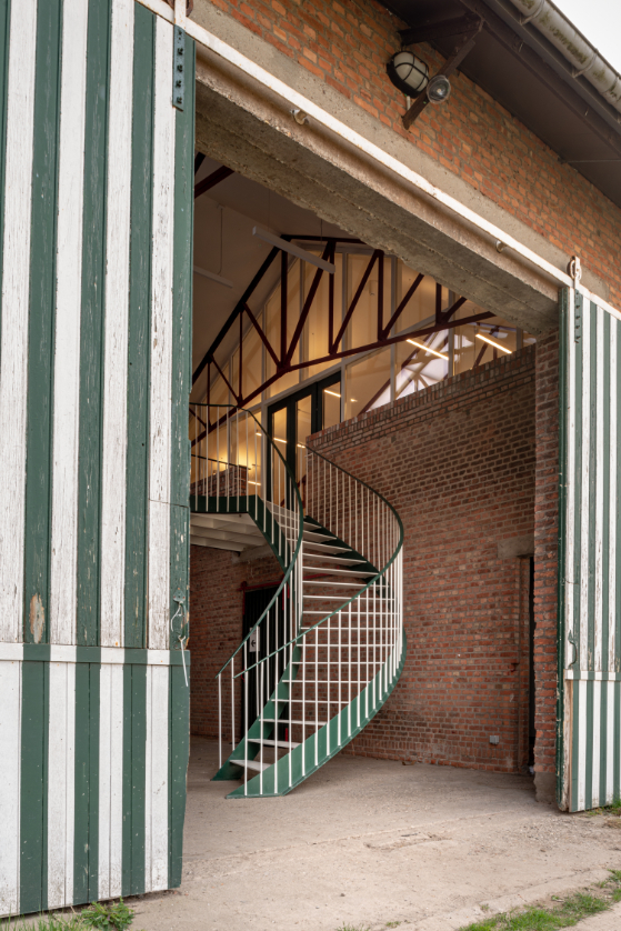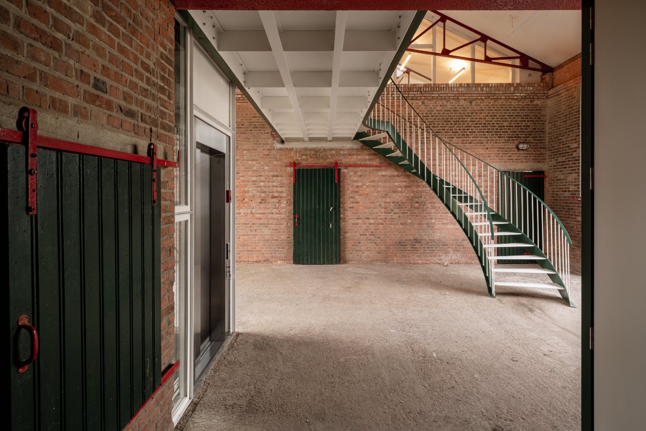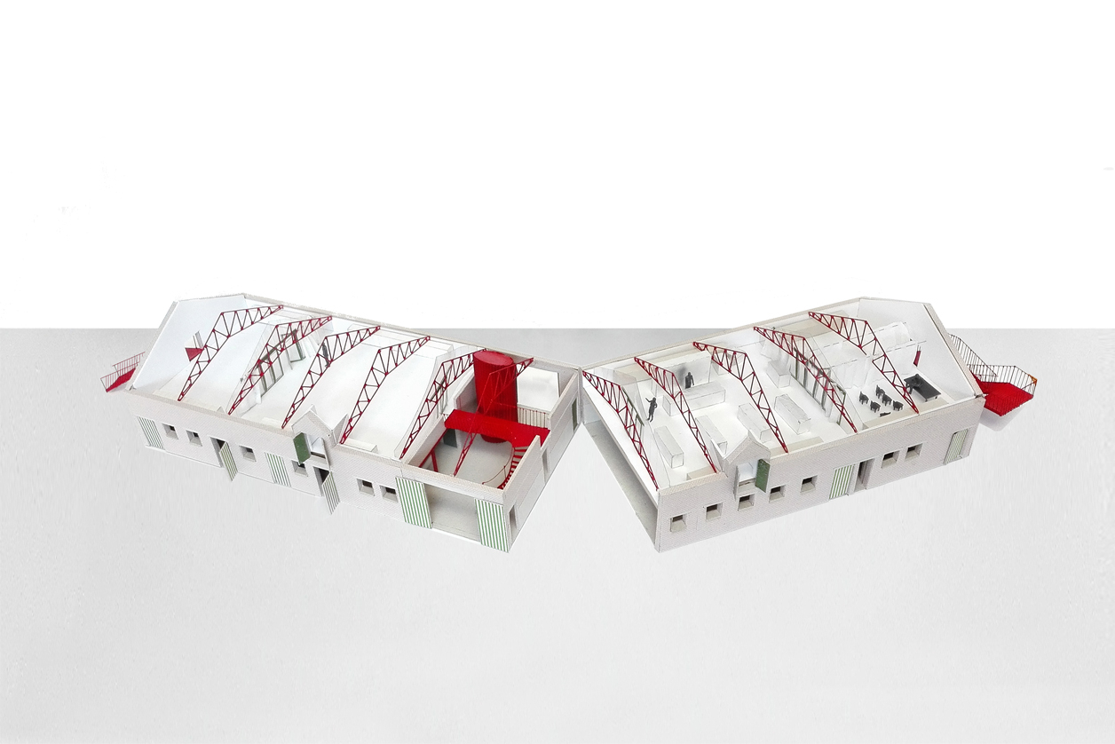 We knippen de verdiepingsvloer centraal in het gebouw ter hoogte van de inrijpoort weg. Hier integreren we een nieuwe interne verticale circulatie. Twee buitentrappen als armen op de kopse zijdes van het gebouw. Deze laten het toe de verdieping flexibel te gebruiken.
