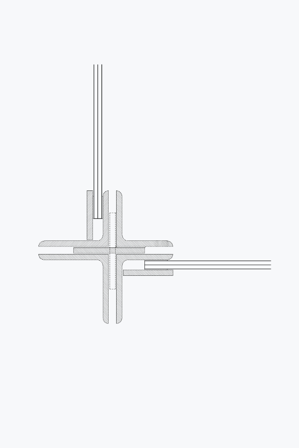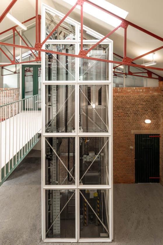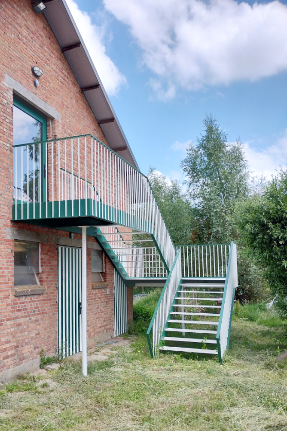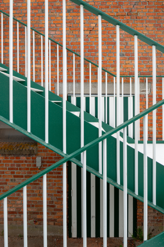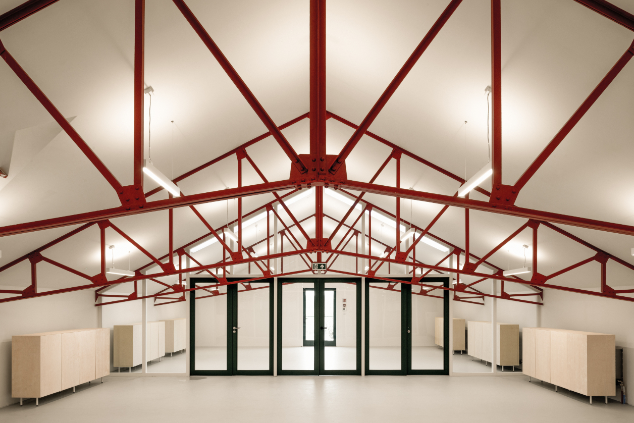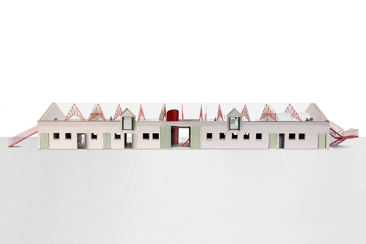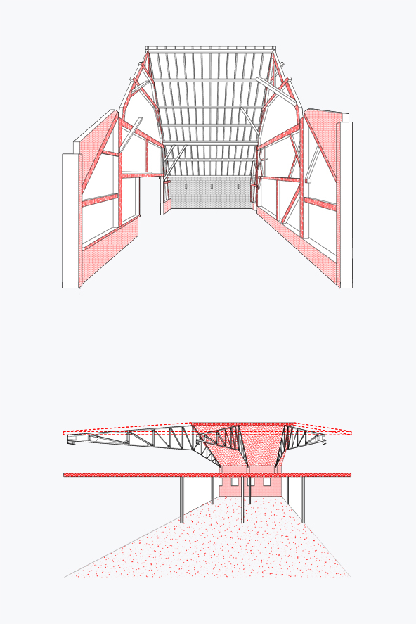We knippen de verdiepingsvloer centraal in het gebouw ter hoogte van de inrijpoort weg. Hier integreren we een nieuwe interne verticale circulatie. Twee buitentrappen als armen op de kopse zijdes van het gebouw. Deze laten het toe de verdieping flexibel te gebruiken.