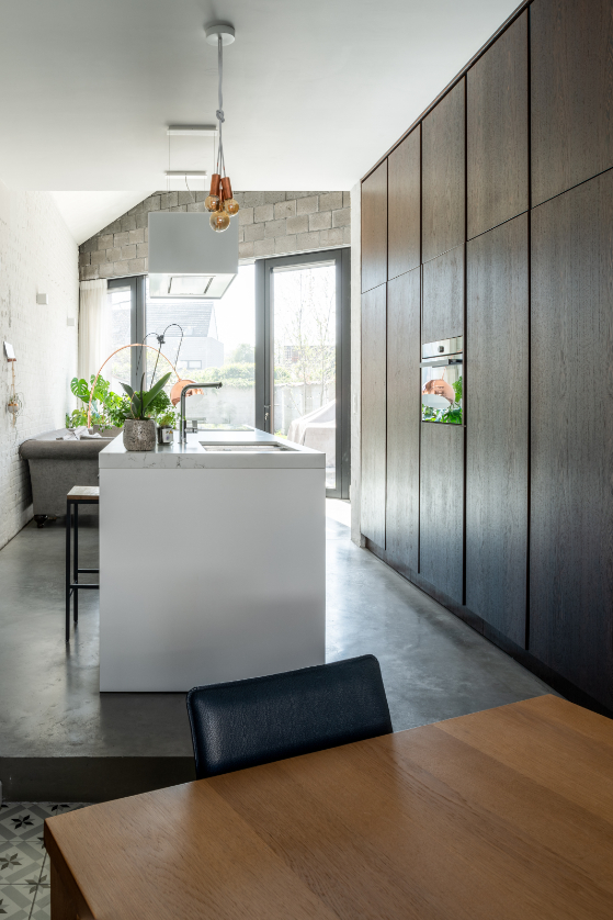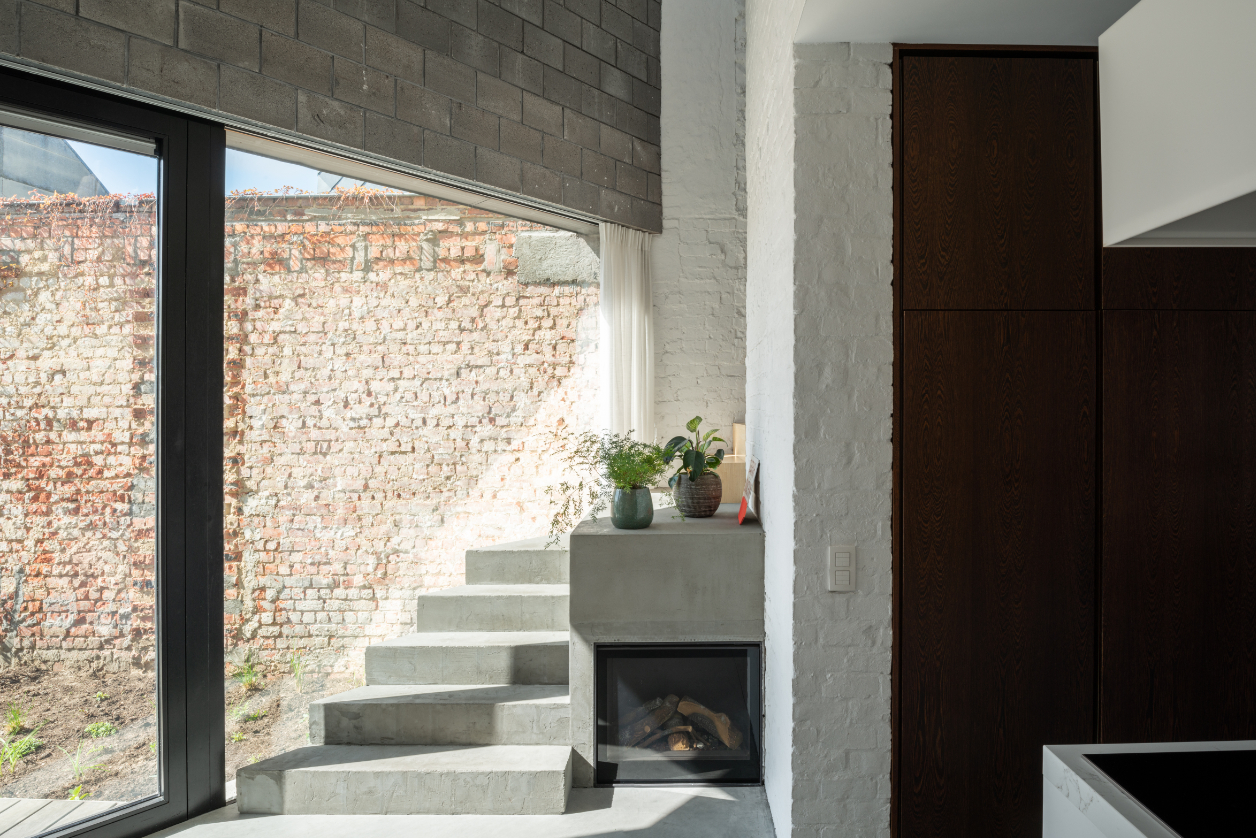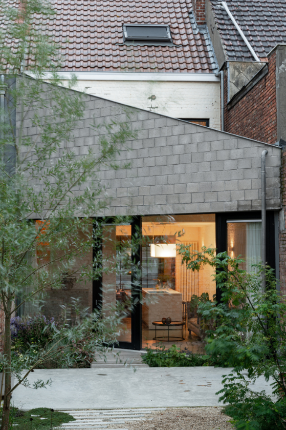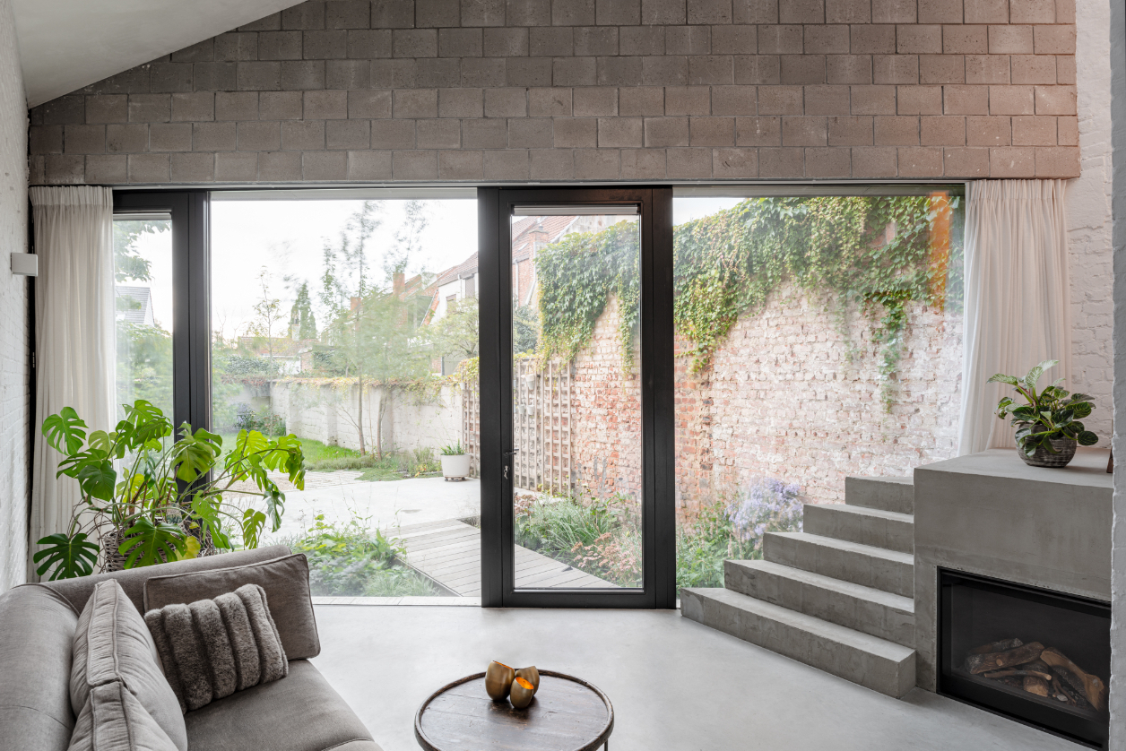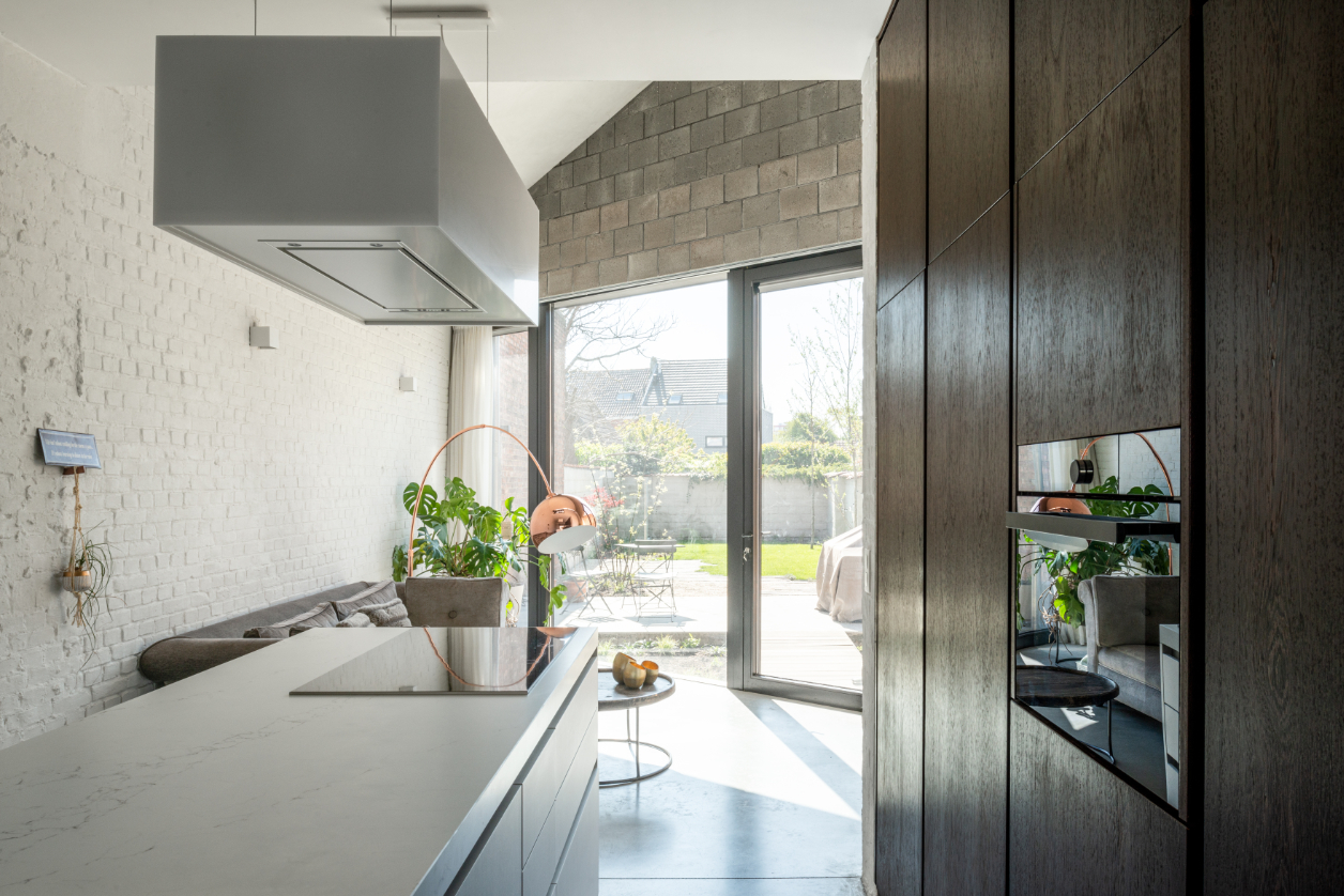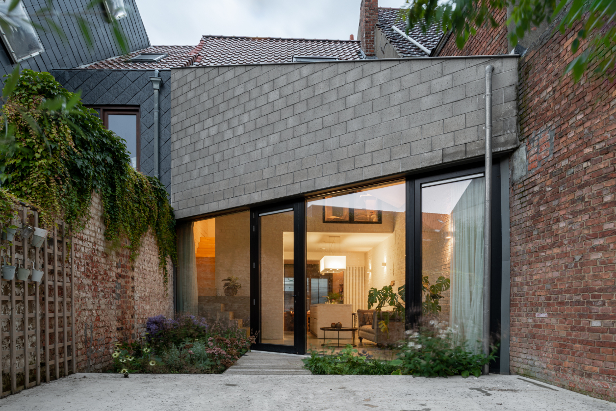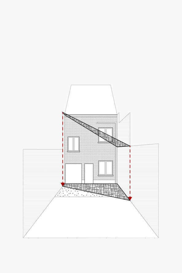 De verouderde achterbouwen worden gesloopt en vervangen door één compacte, dubbelhoge uitbouw. Deze krijgt vorm door het volgen van de bestaande hoge gemene muren. Zo past deze uitbreiding zich perfect in in zijn context & blijft de constructie van de nieuwe ruimte beperkt tot de bouw van één nieuwe achtergevel met een nieuw dak.