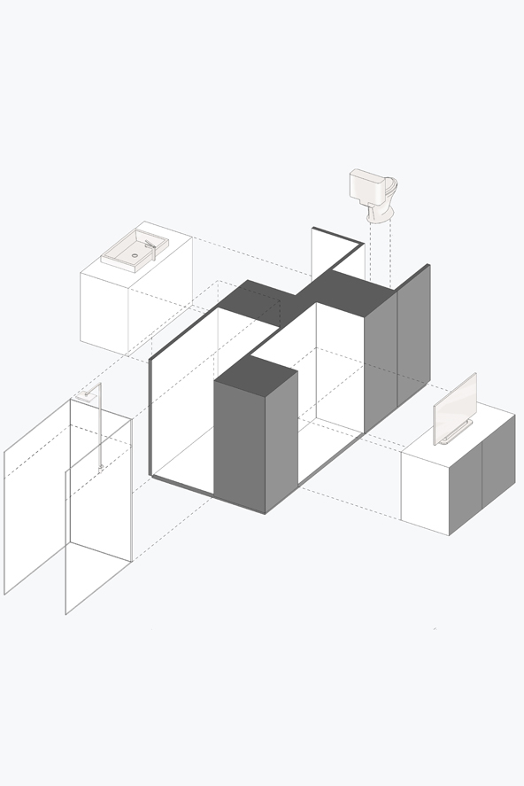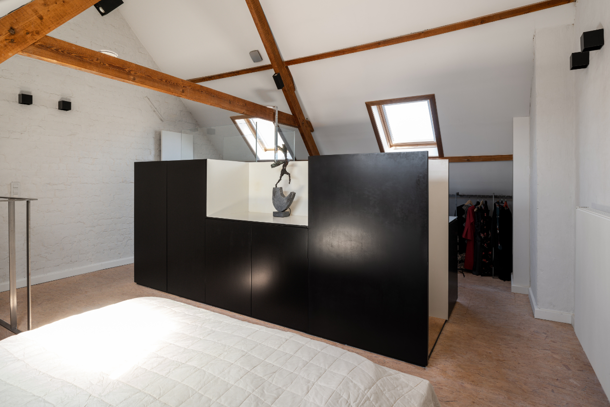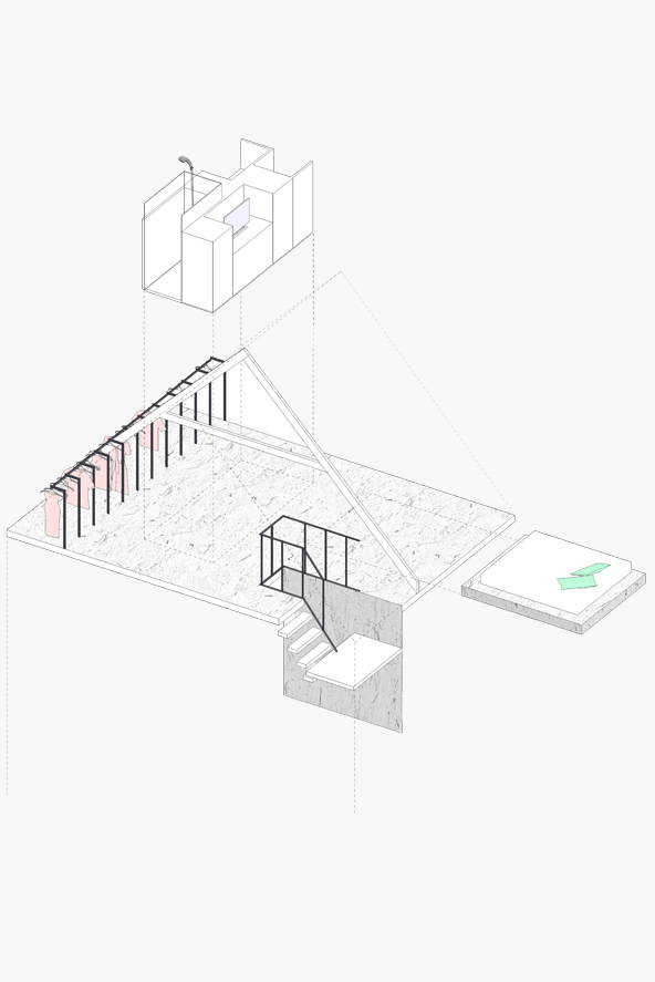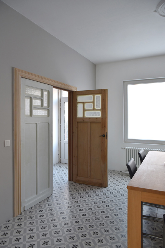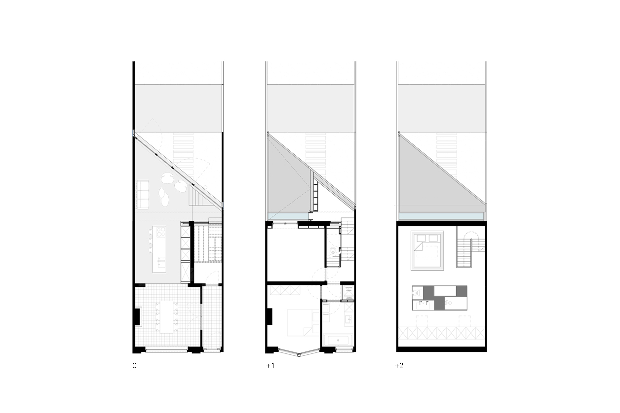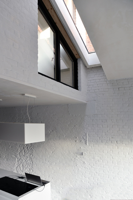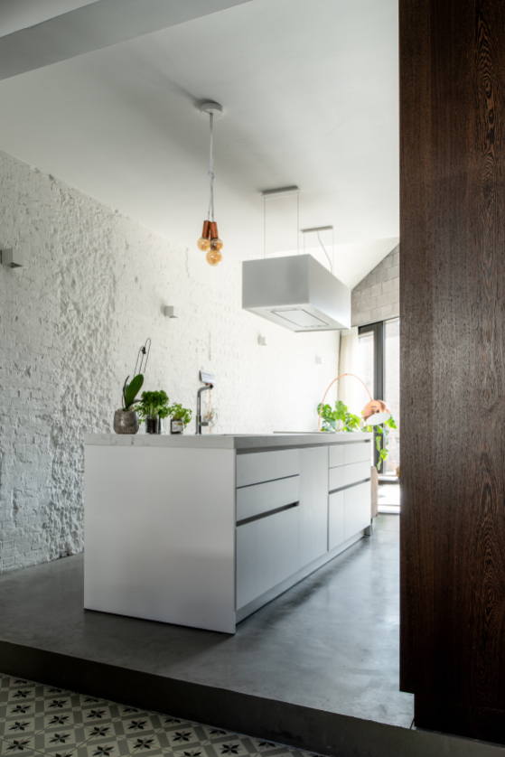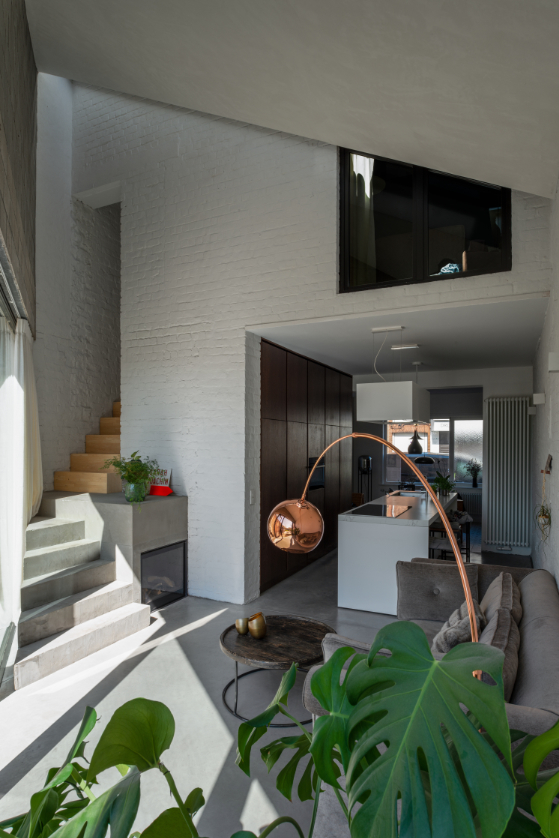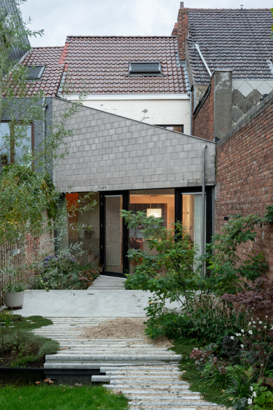 De verouderde achterbouwen worden gesloopt en vervangen door één compacte, dubbelhoge uitbouw. Deze krijgt vorm door het volgen van de bestaande hoge gemene muren. Zo past deze uitbreiding zich perfect in in zijn context & blijft de constructie van de nieuwe ruimte beperkt tot de bouw van één nieuwe achtergevel met een nieuw dak.
