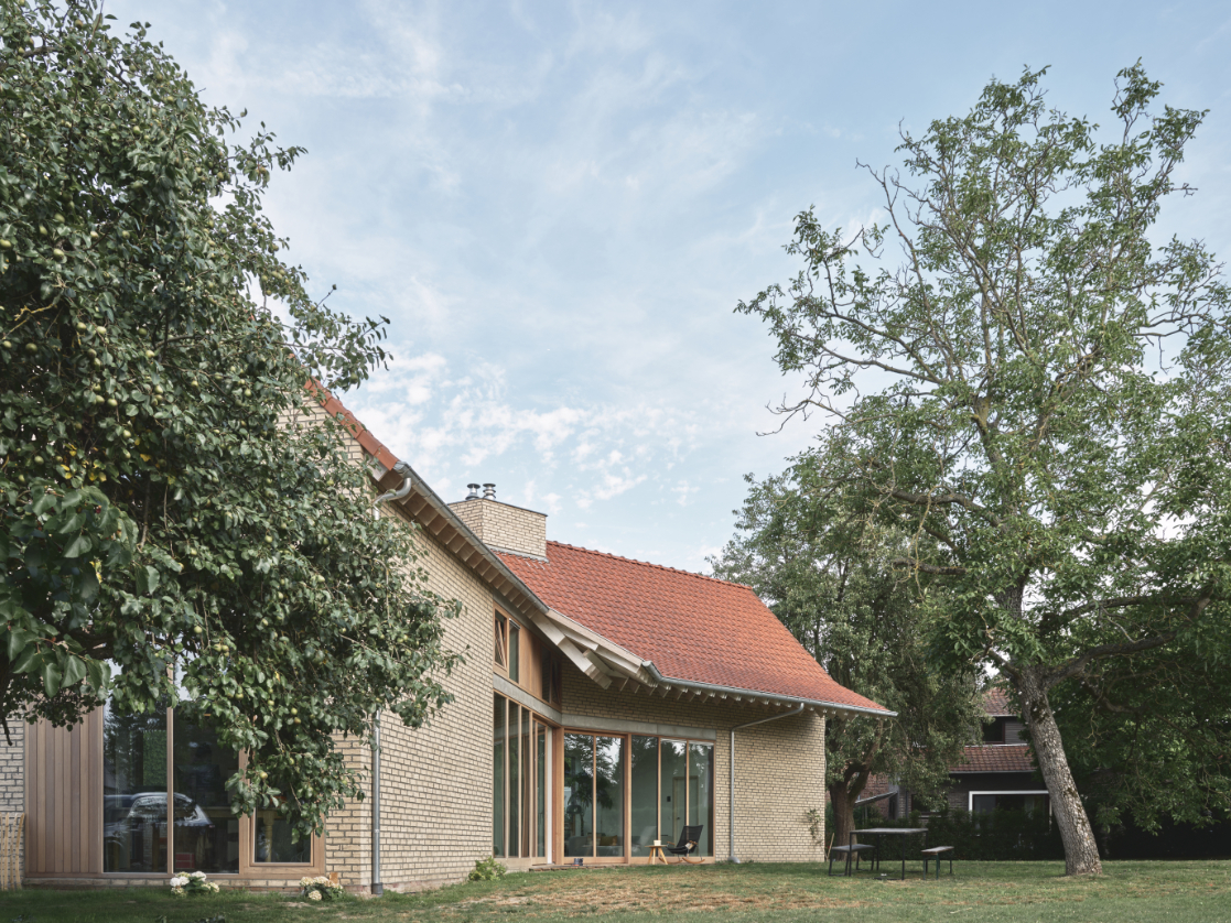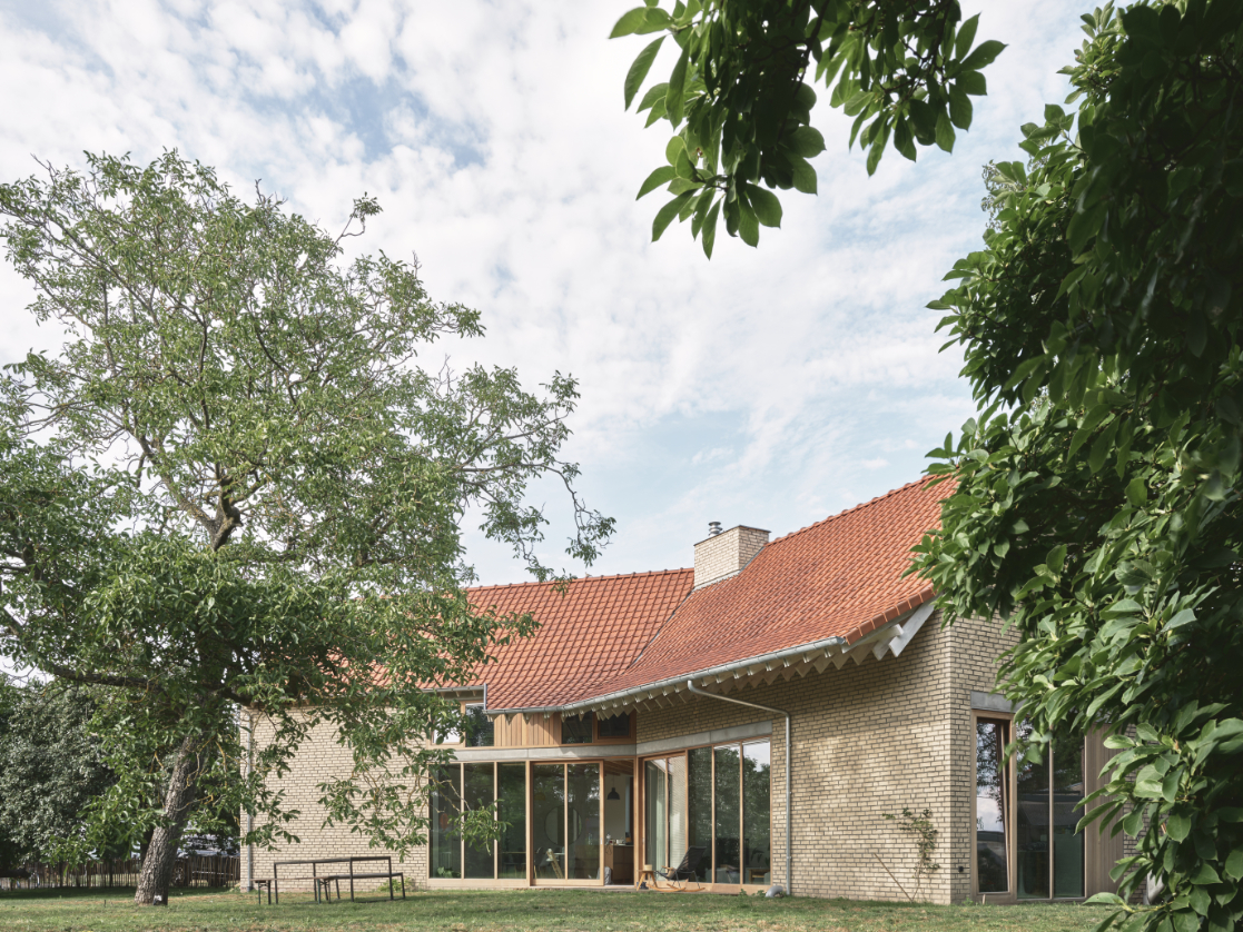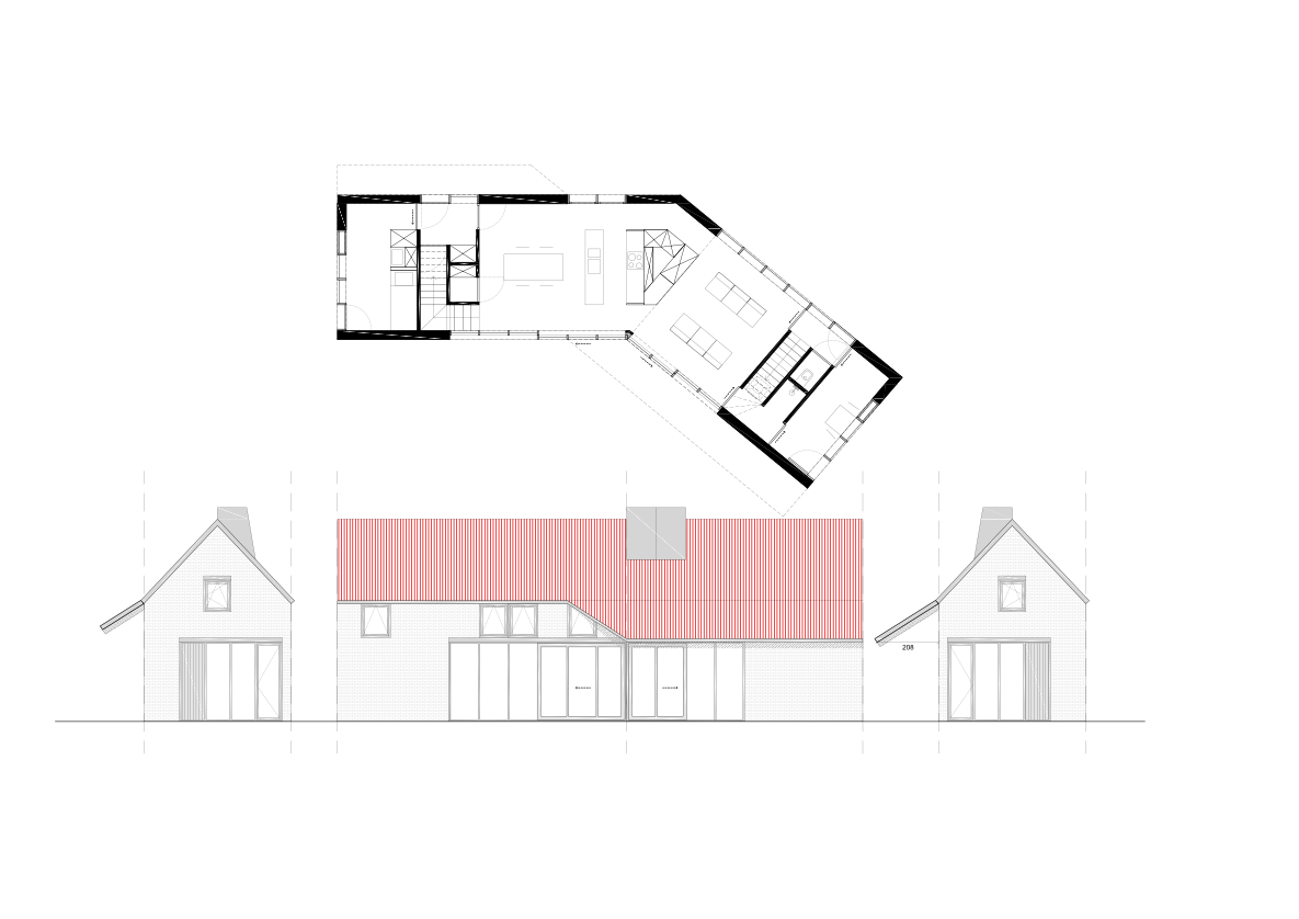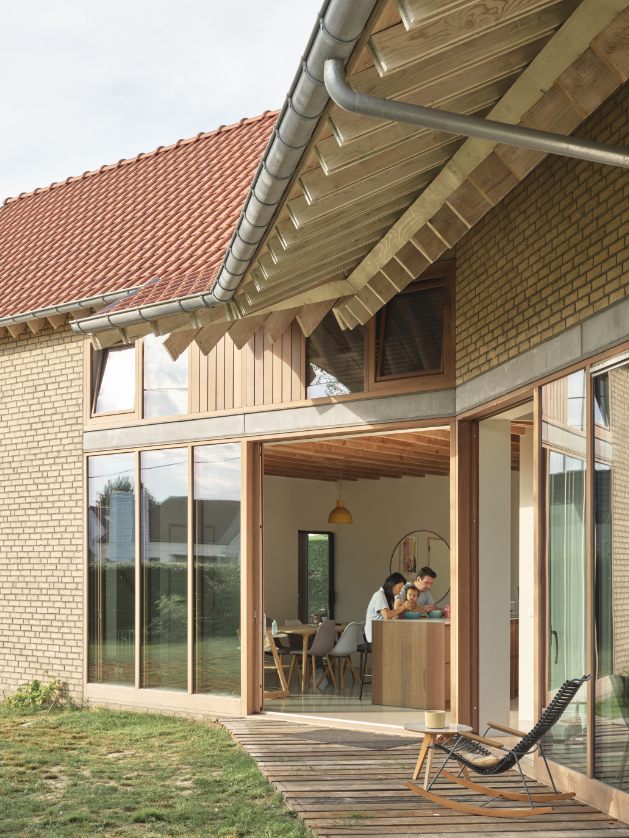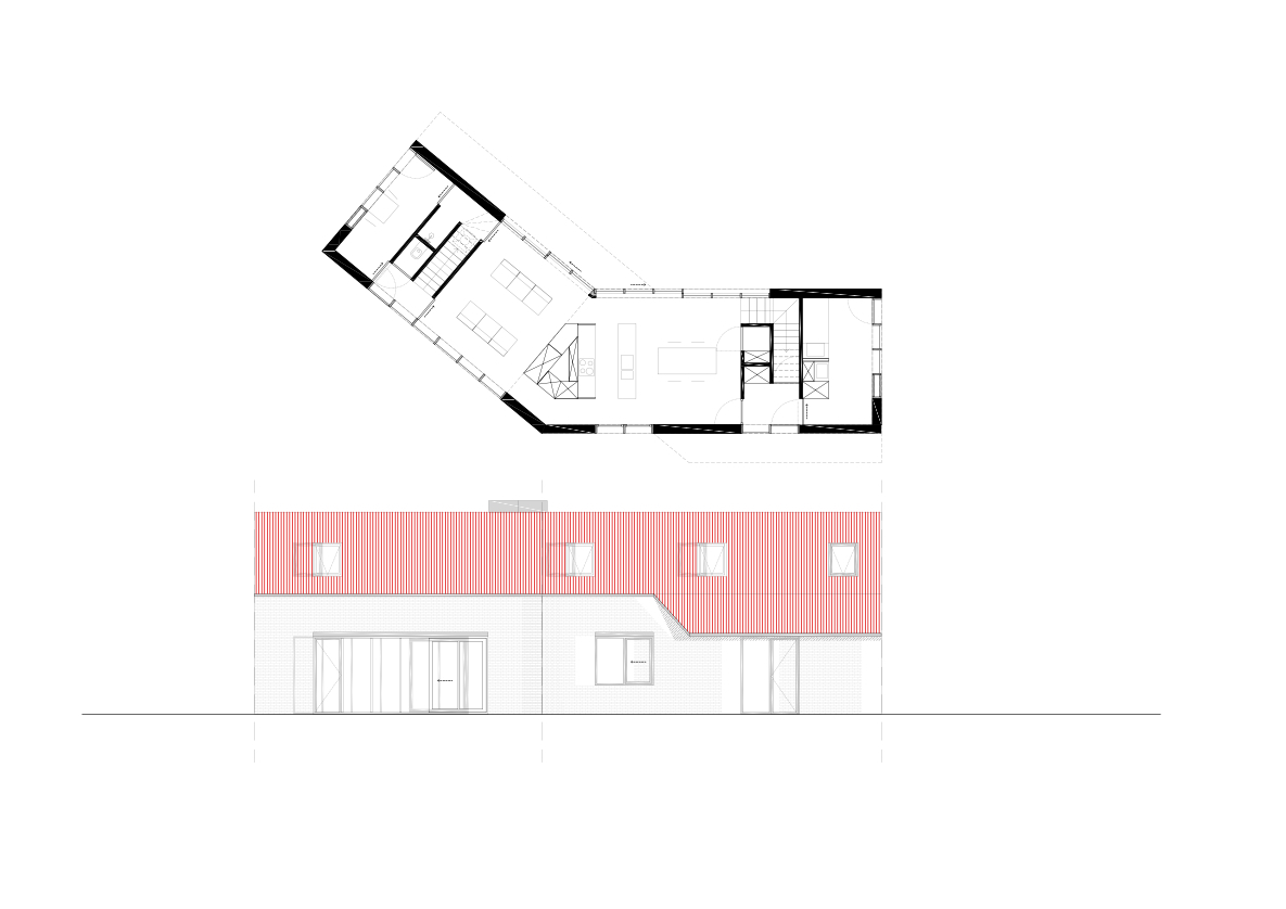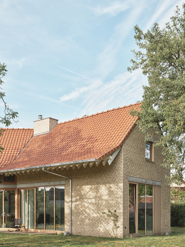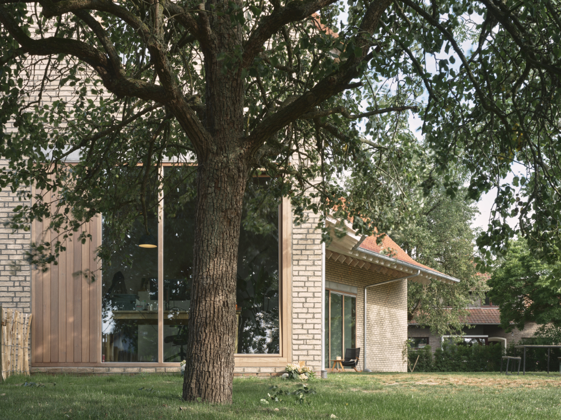 De bestaande rechthoekige 18e-eeuwse hoeve strektte zich over 2 percelen. We breken deze integraal af en herbouwen met een vormelijke knipoog naar authentieke hoeve elementen. Tussen de keuken en living laten we de woning knikken. Een simpele ingreep wat voor maximale zichten zorgt.
