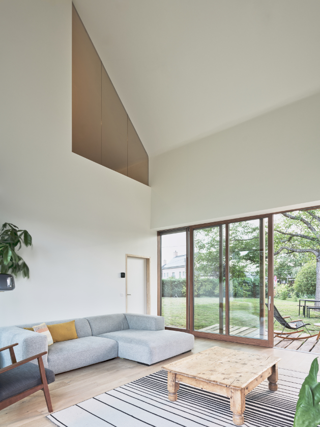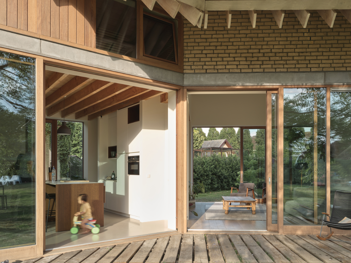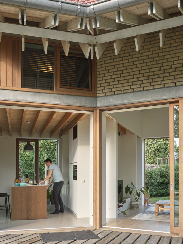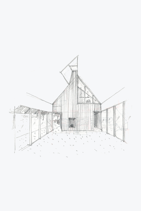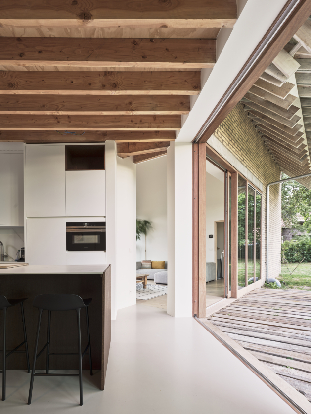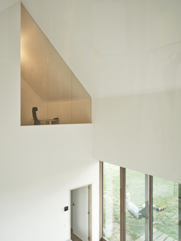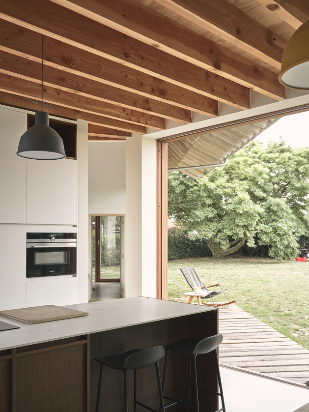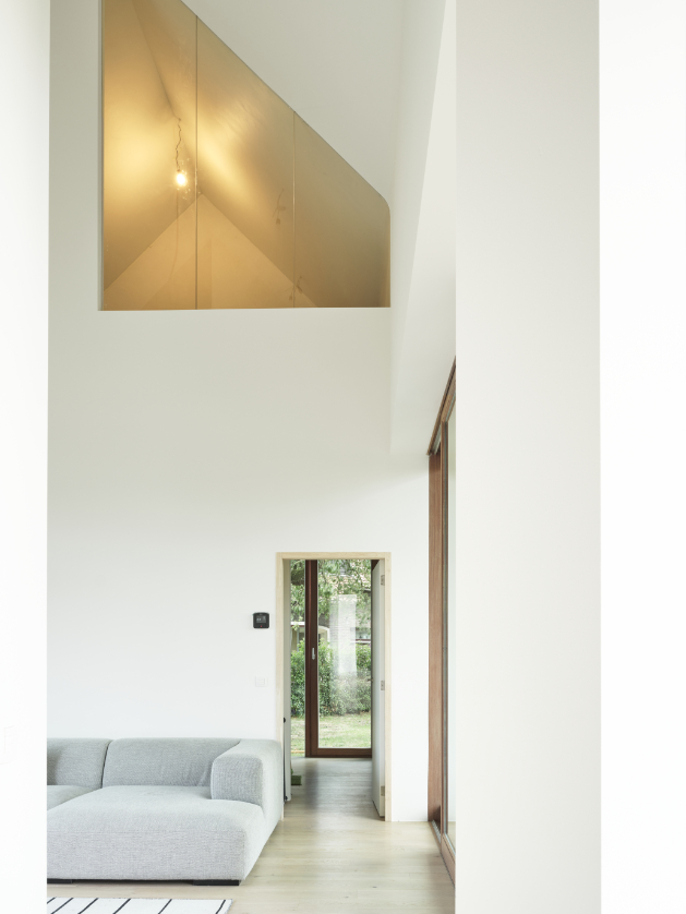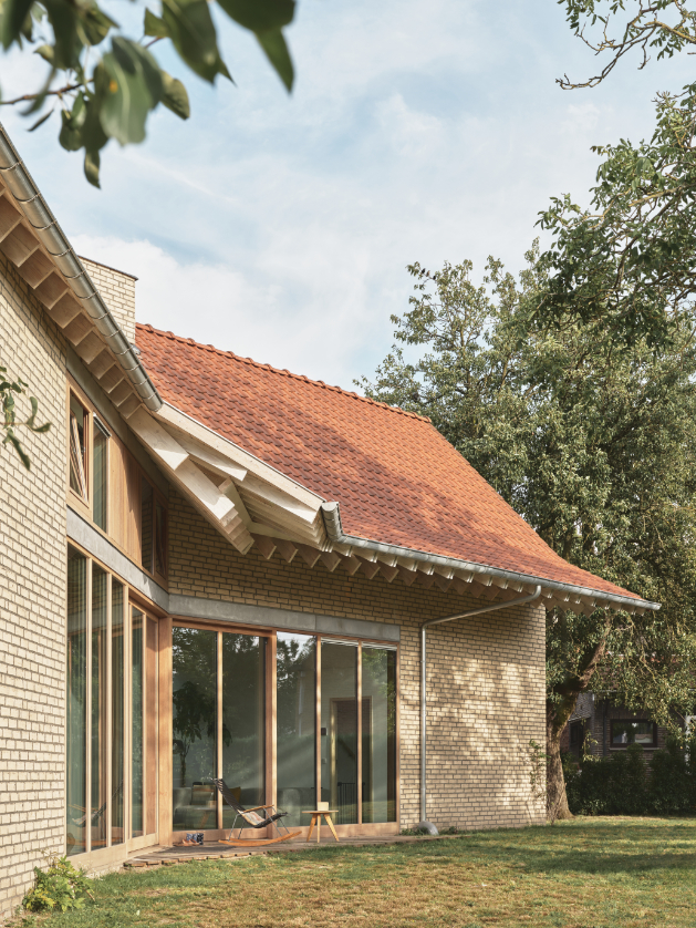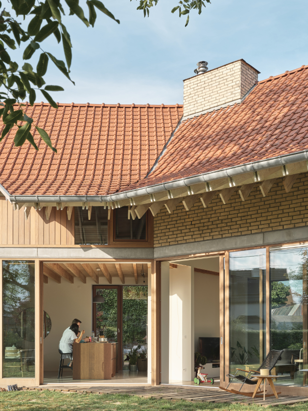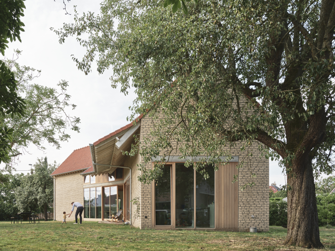 De bestaande rechthoekige 18e-eeuwse hoeve strektte zich over 2 percelen. We breken deze integraal af en herbouwen met een vormelijke knipoog naar authentieke hoeve elementen. Tussen de keuken en living laten we de woning knikken. Een simpele ingreep wat voor maximale zichten zorgt.